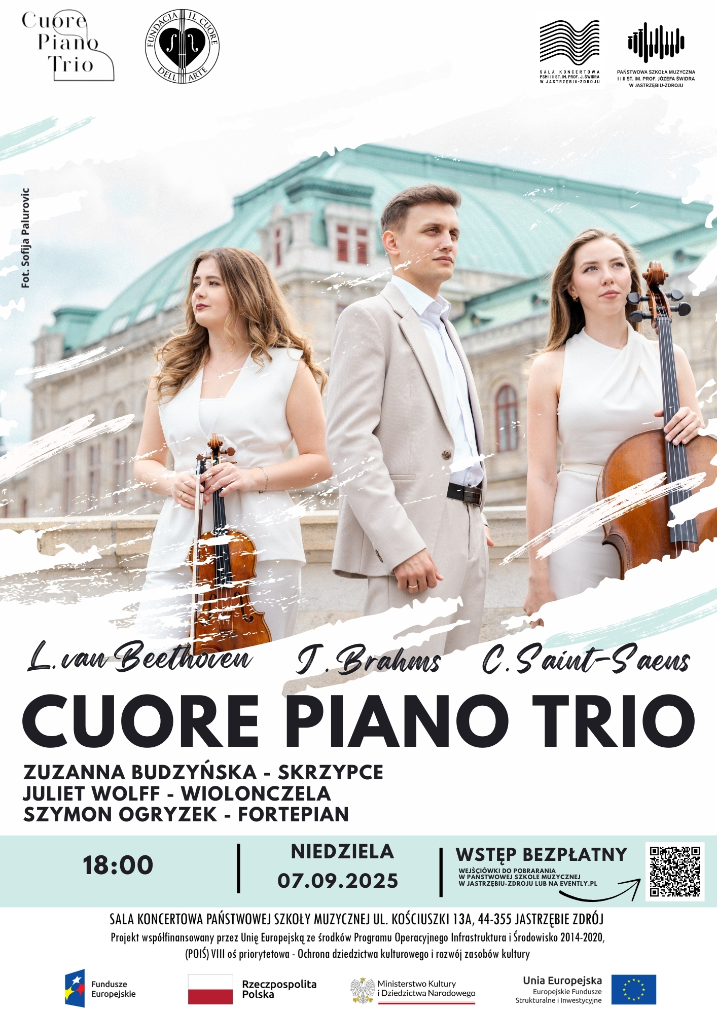 Zapraszamy na Koncert CUORE PIANO TRIO, który odbędzie się 7 września 2025 r. o godzinie 18:00 w Sali Koncertowej Szkoły Muzycznej w Jastrzębiu-Zdroju. Darmowe wejściówki do pobrania w Szkole Muzycznej w Jastrzębiu-Zdroju i na EVENTLY.PL