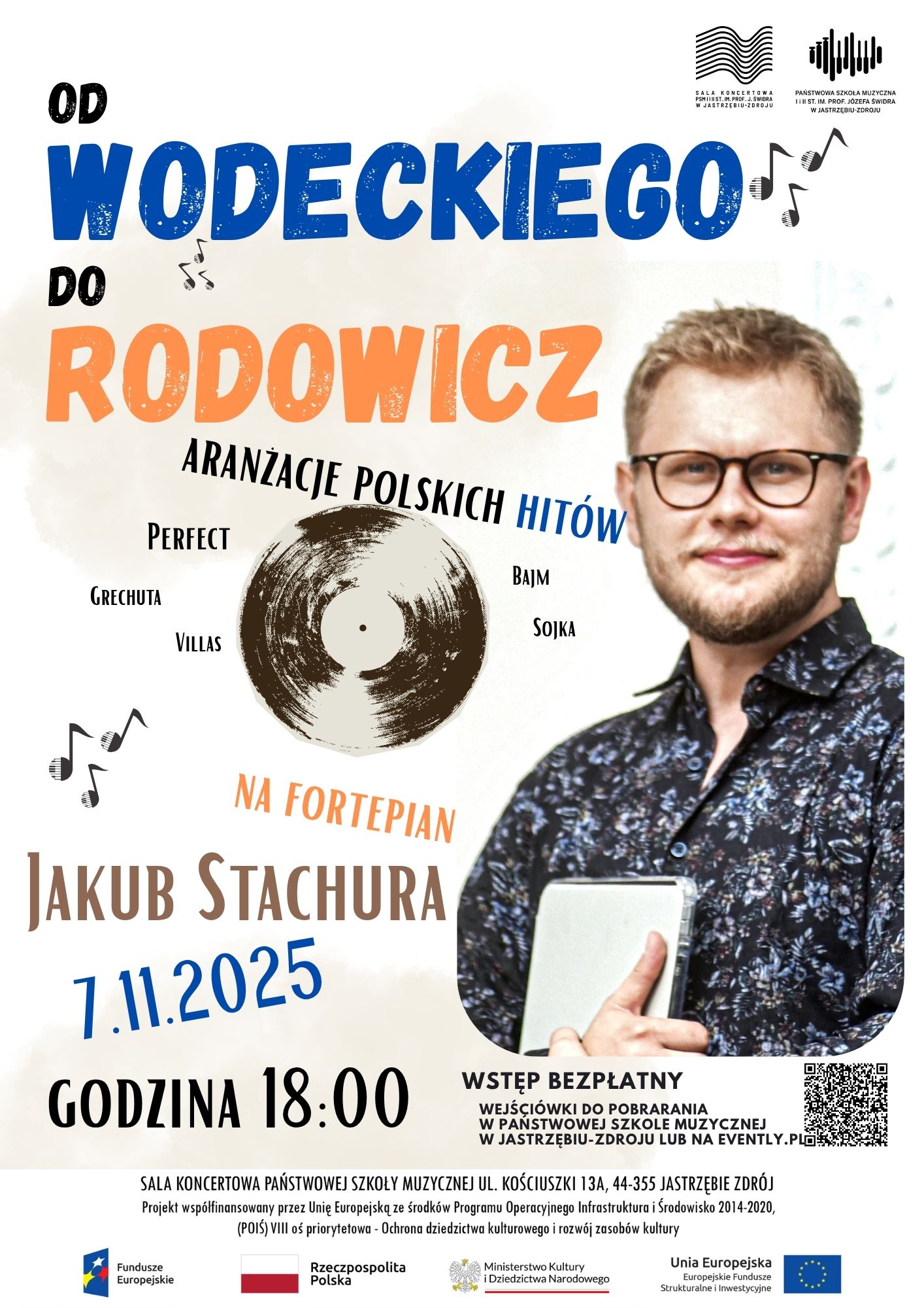 Zapraszamy na Koncert "Od Wodeckiego do Rodowicz" Polskie hity na fortepian w aranżacji Jakuba Stachury, który odbędzie się 7 listopada 2025 r. o godzinie 18:00 w Sali Koncertowej Szkoły Muzycznej w Jastrzębiu-Zdroju. Darmowe wejściówki do pobrania w Szkole Muzycznej w Jastrzębiu-Zdroju i na EVENTLY.PL