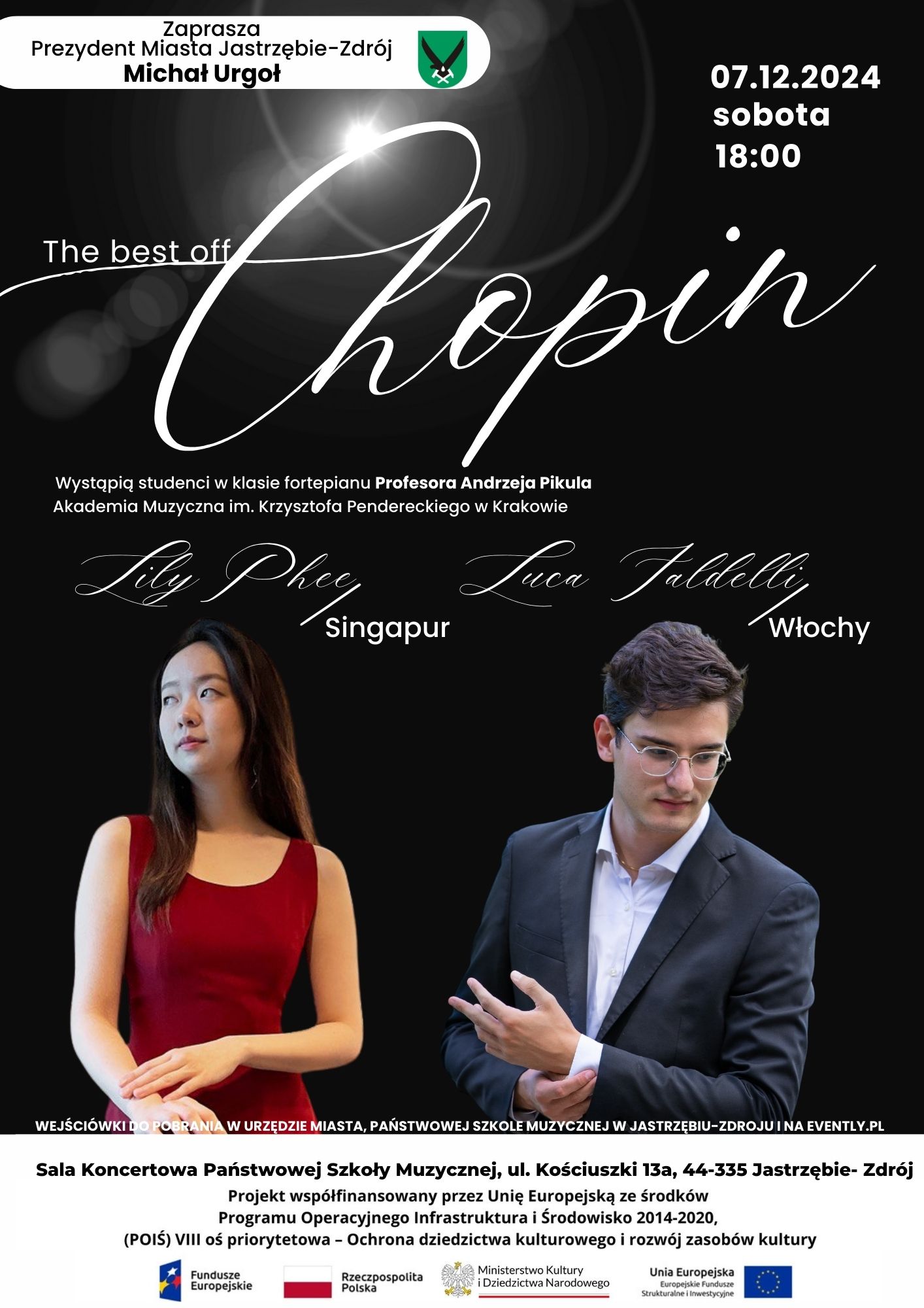 Prezydent Miasta Jastrzębia-Zdroju zaprasza na koncert The best off Chopin, który odbędzie się 7 grudnia 2024 r. o godzinie 18:00 w sali koncertowej Szkoły Muzycznej w Jastrzębiu-Zdroju. Bezpłatne wejściówki do pobrania w Urzędzie Miasta, w Państwowej Szkole Muzycznej i na evently.pl