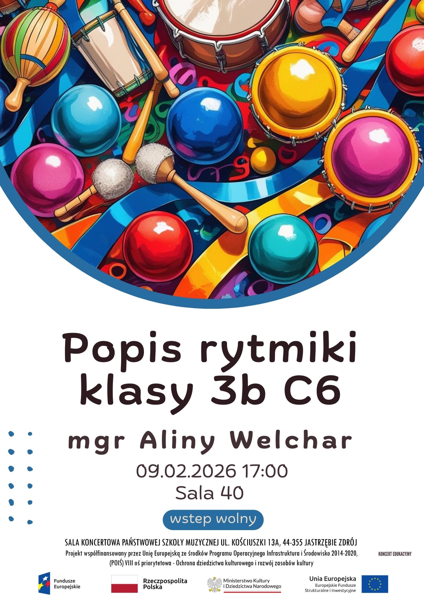 Zapraszamy na Popis rytmiki kl. III b C6 mgr Aliny Welchar, który odbędzie się 9 lutego 2026 r. o godzinie 17:00 w sali nr 40 Szkoły Muzycznej w Jastrzębiu-Zdroju. Wstęp wolny.