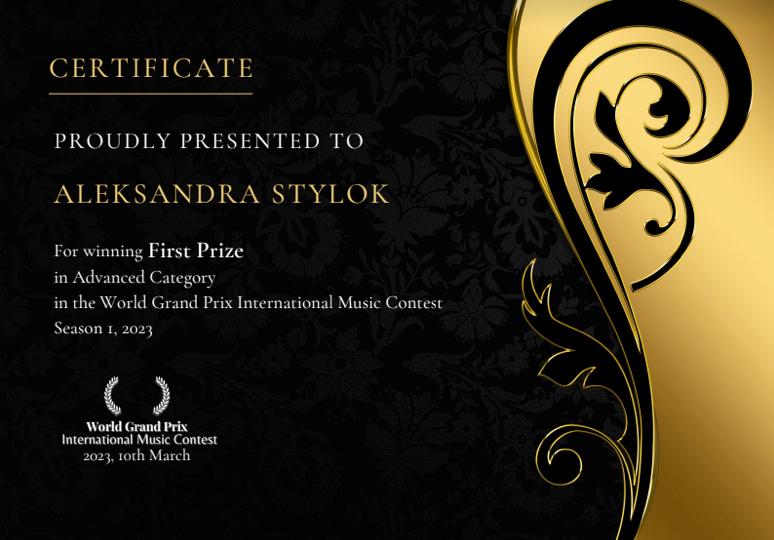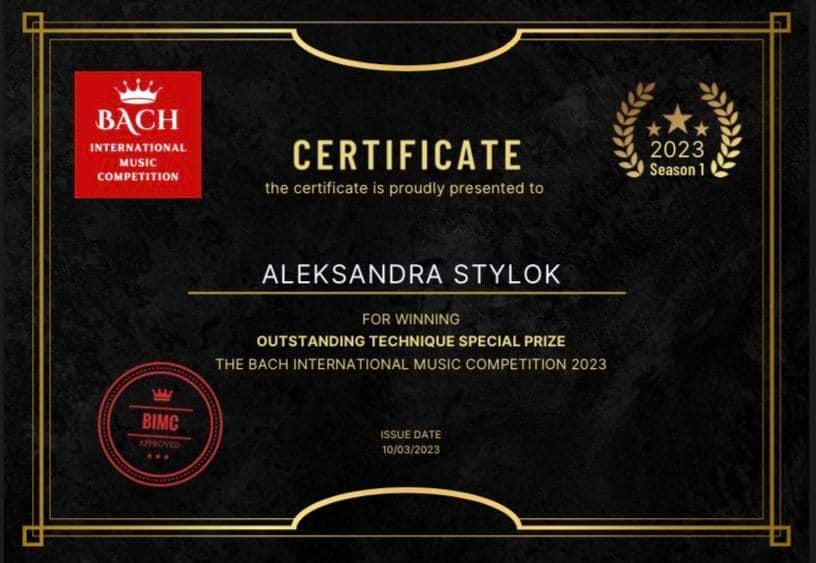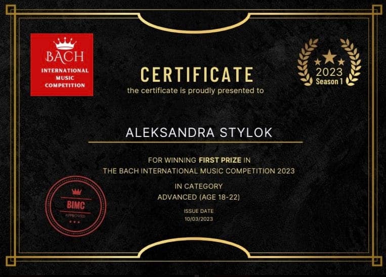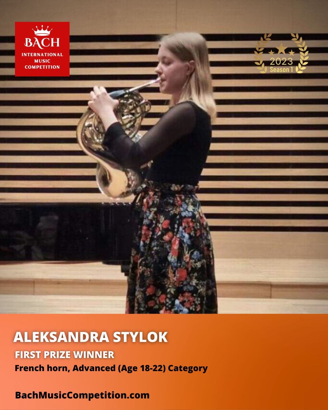 Z radością i dumą informujemy, że nasza uczennica Aleksandra Stylok z klasy waltorni Tomasza Wójtowicza zdobyła pierwszą nagrodę i wyróżnienie za techniczne przygotowanie utworu w konkursie The Bach International Music Competition 2023 w Londynie oraz pierwszą nagrodę w kategorii Advanced w World Grand Prix International Music Contest!