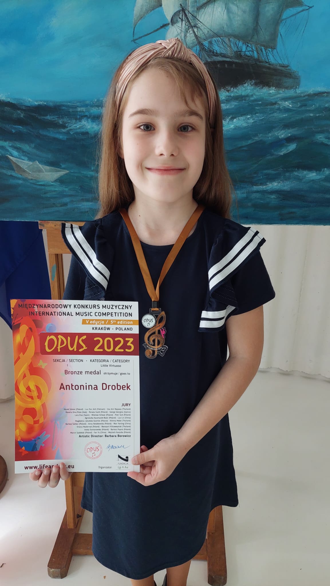 - BRĄZOWY MEDAL - Międzynarodowy Konkurs Muzyczny „OPUS 2023”, V edycja, Kraków, 8.05.2023 r., edycja online - kategoria Mały Wirtuoz
