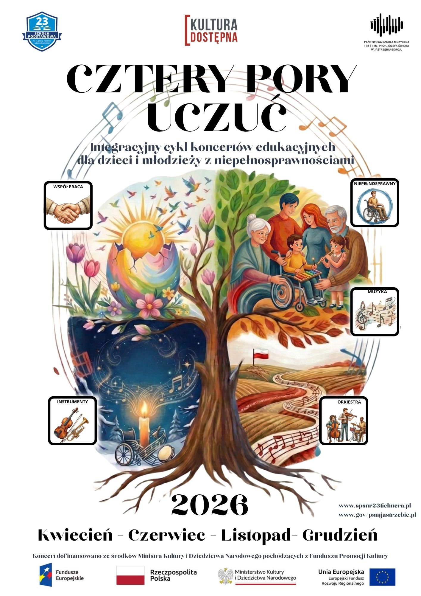 Nauczyciele i Uczniowie naszej szkoły wraz ze Szkołą Podstawową Specjalną nr 23 im. ks. prof. Józefa Tischnera w Jastrzębiu-Zdroju realizują wyjątkowy projekt edukacyjno-artystyczny skierowany do dzieci i młodzieży z niepełnosprawnościami ruchowymi i intelektualnymi. Przedsięwzięcie obejmuje organizację czterech interaktywnych koncertów "Cztery pory uczuć", które poprzez muzykę i poezję wspierają rozwój, integrację społeczną oraz budowanie pozytywnych doświadczeń kulturalnych.