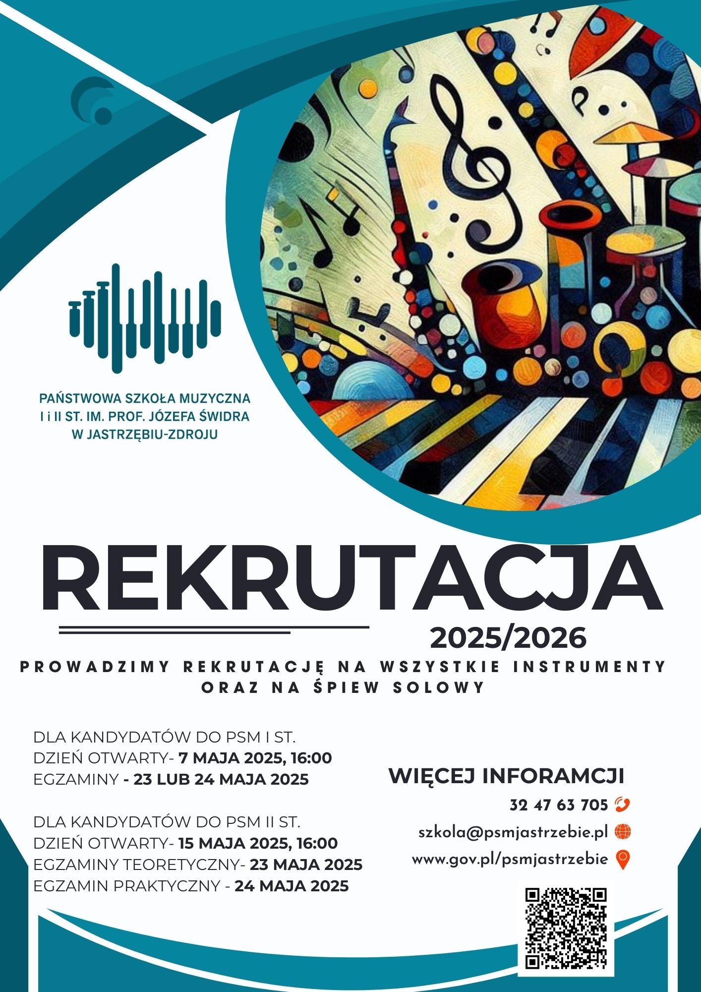Plakat rekrutacyjny Państwowej Szkoły Muzycznej I i II stopnia im. prof. Józefa Świdra w Jastrzębiu-Zdroju na rok szkolny 2025/2026.