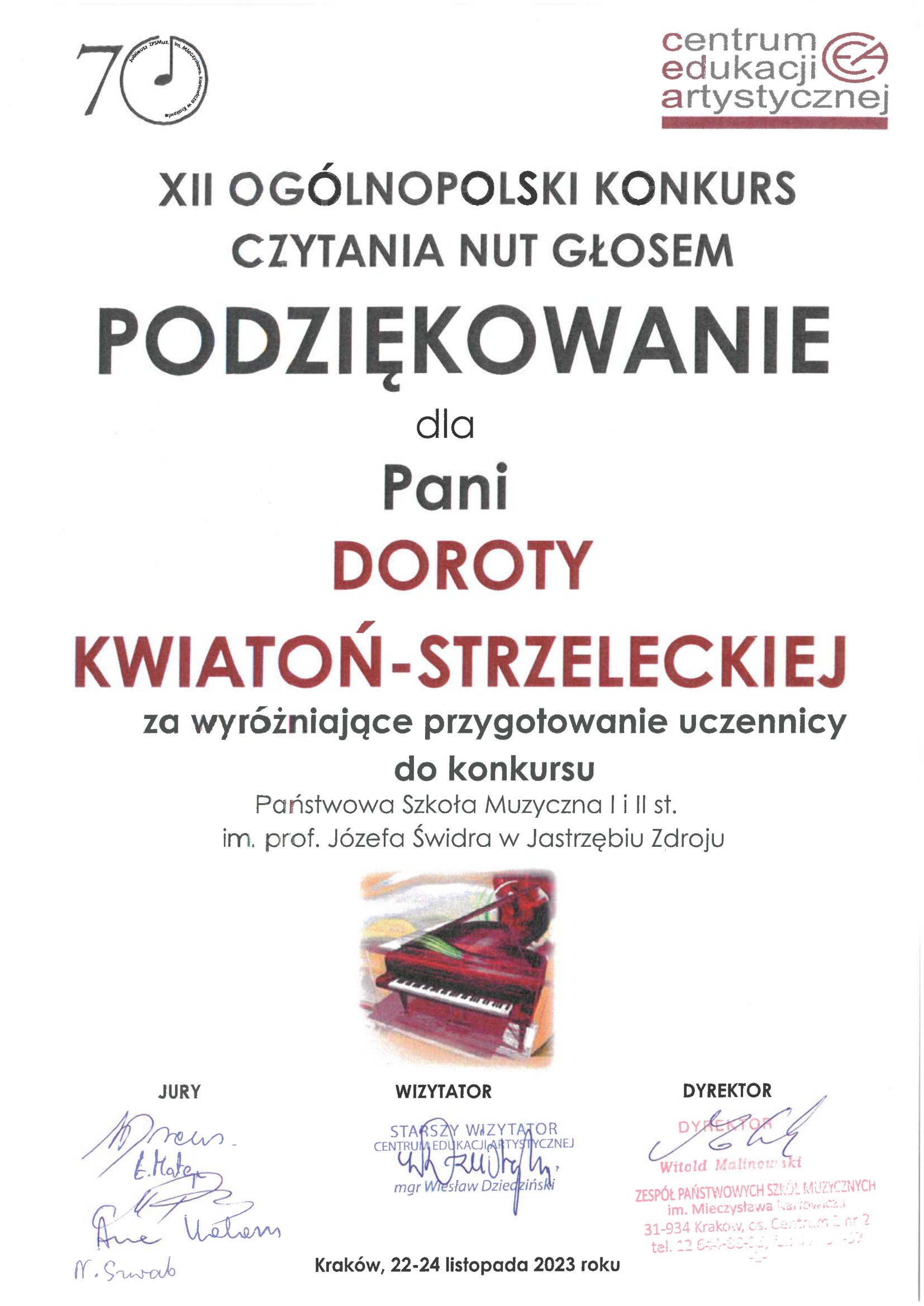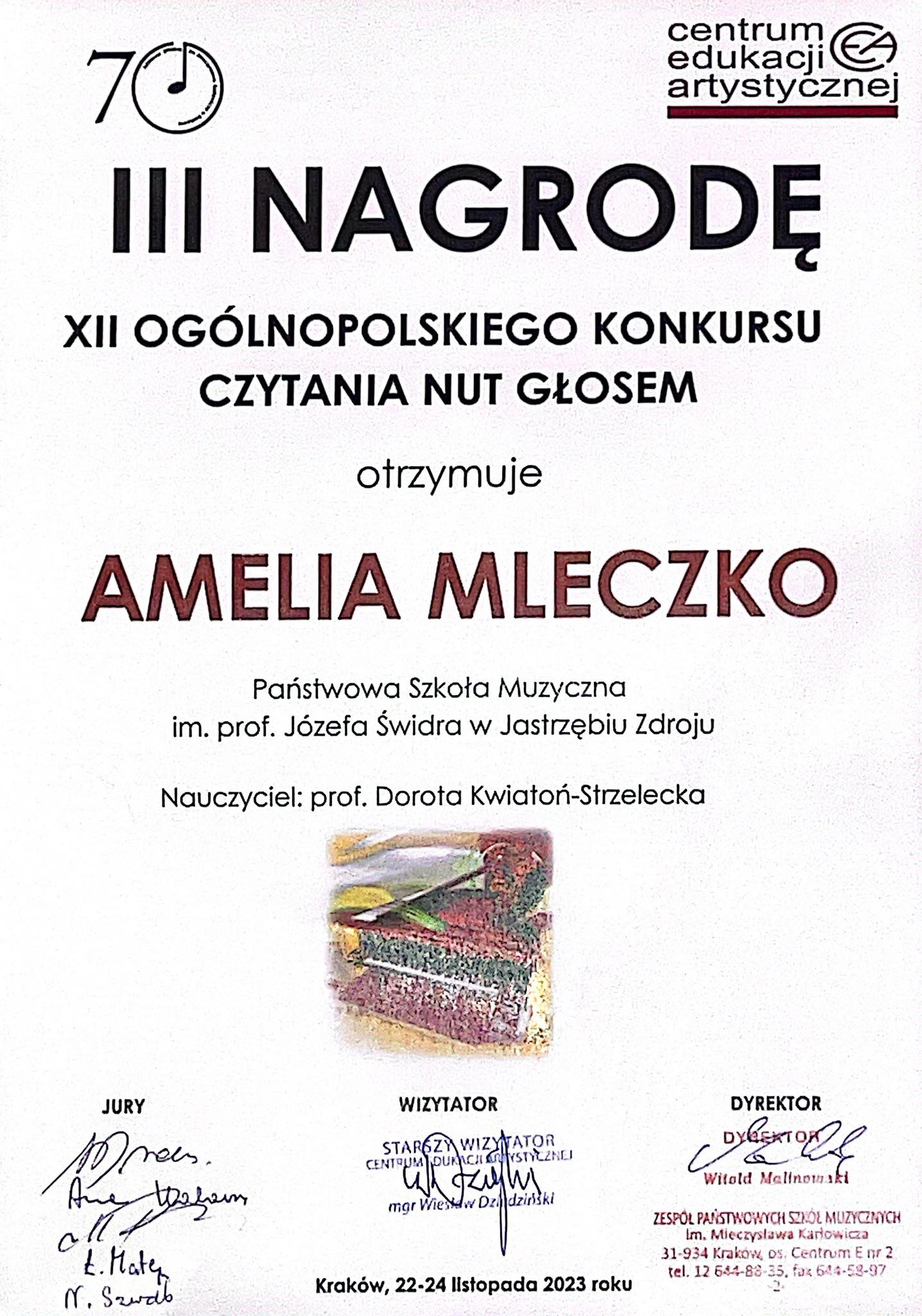 W dniach 23-24 listopada 2023 uczennica klasy 5 szkoły II stopnia Amelia Mleczko brała udział w XII Ogólnopolskim Konkursie Czytania Nut Głosem dla uczniów szkół muzycznych II stopnia w Krakowie. Organizatorem konkursu było Centrum Edukacji Artystycznej.
