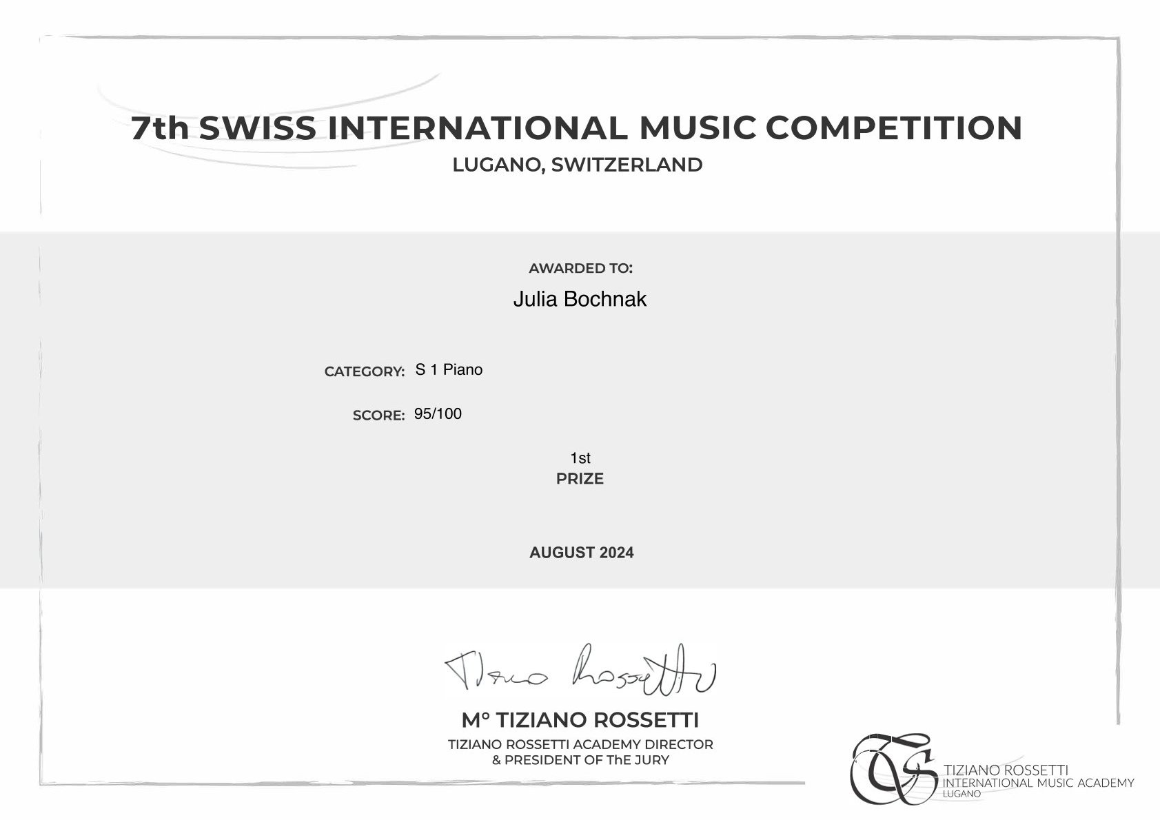 I MIEJSCE- VII Swiss International Music Competition, Lugano (Szwajcaria), sierpień 2024 r.