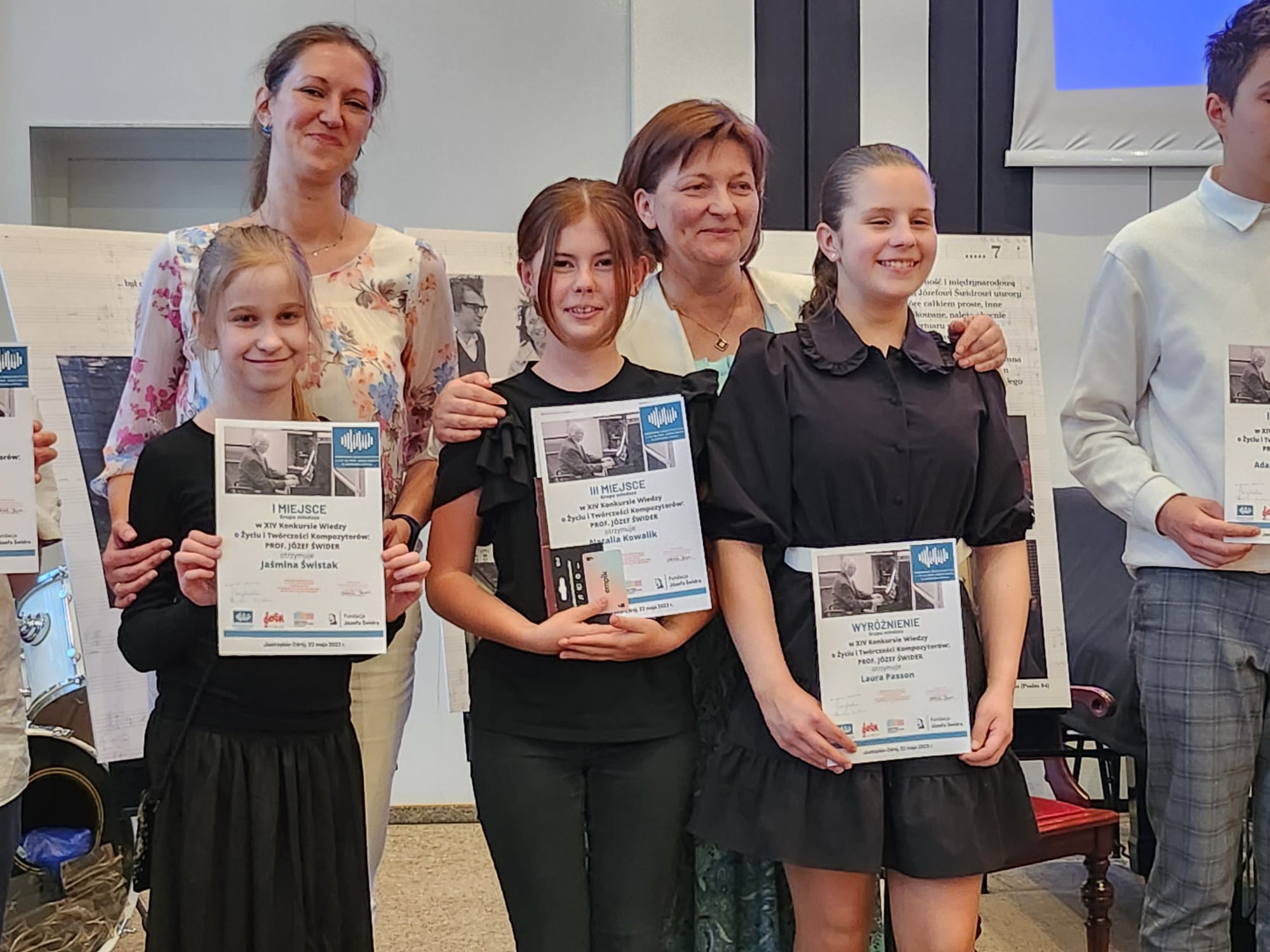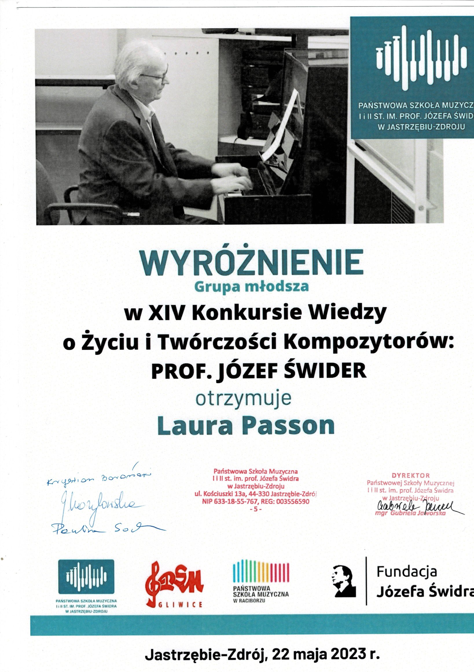 - WYRÓŻNIENIE - XIV Konkurs Wiedzy o Życiu i Twórczości Kompozytorów: prof. Józef Świder, Jastrzębie-Zdrój, 22.05.2023 r. - grupa młodsza, przygotowanie mgr Gabriela Jaworska