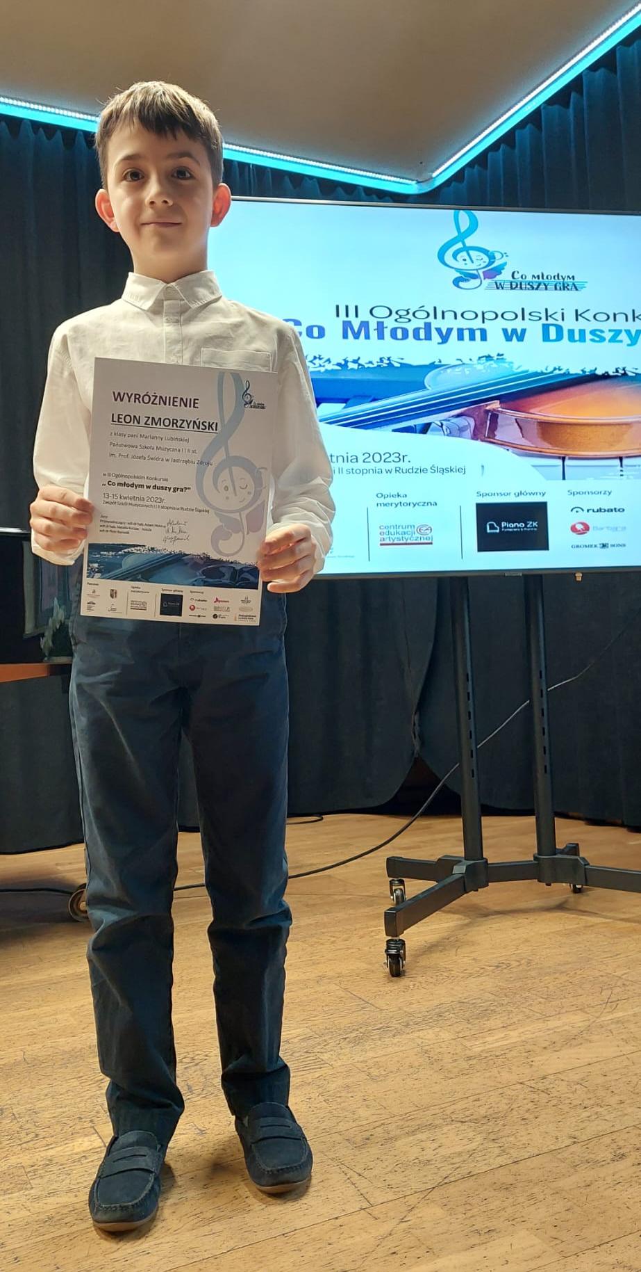 Leon jest uczniem klasy wiolonczeli Pani Marianny Lubińskiej.