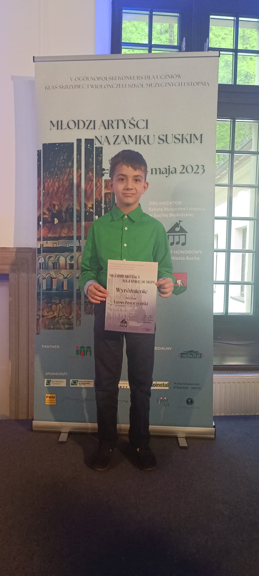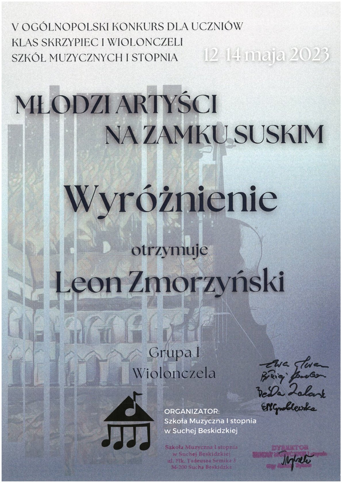 - WYRÓŻNIENIE - V Ogólnopolski Konkurs dla Uczniów Klas Skrzypiec i Wiolonczeli Szkół Muzycznych I stopnia „MŁODZI ARTYŚCI NA ZAMKU SUSKIM” w Suchej Beskidzkiej, 12-14.05.2023 r.