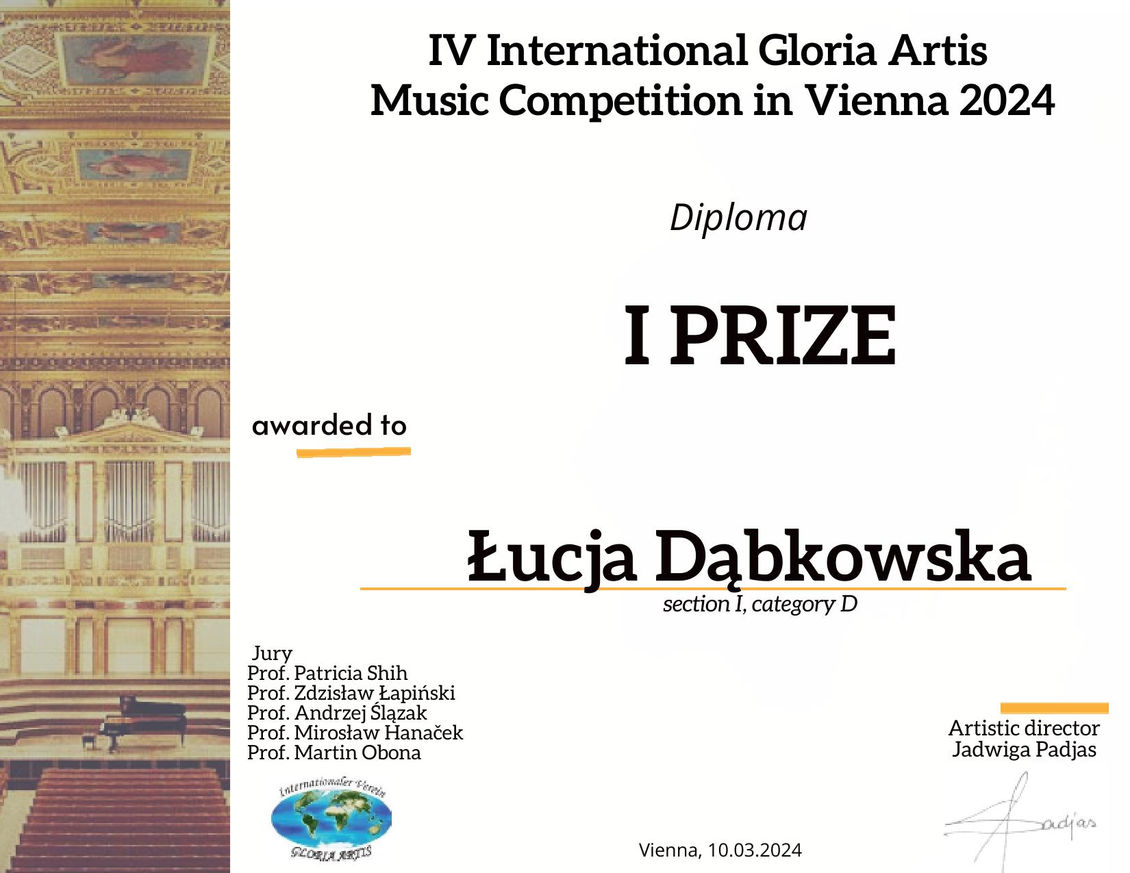 Łucja Dąbkowska z klasy fortepianu Pani Iwony Ulbrich zdobyła PIERWSZE MIEJSCE w IV Międzynarodowym Konkursie Muzycznym "Gloria Artis", który odbył się 10 marca 2024 roku w Wiedniu, w formie online.