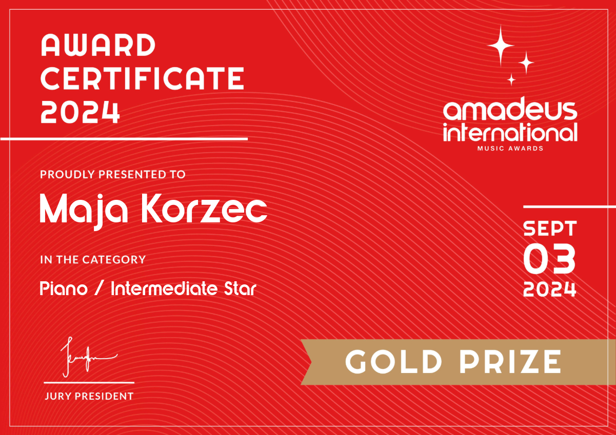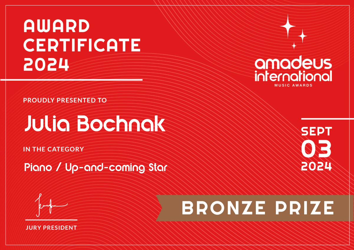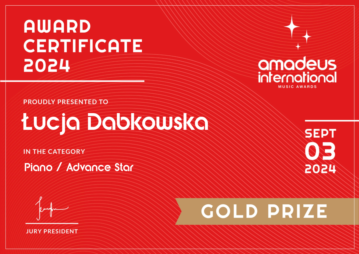 Miło nam poinformować, że Łucja Dąbkowska i Maja Korzec, uczenice klasy fortepianu Pani Iwony Ulbrich zdobyły Złote Medale, a Julia Bochnak, uczennica klasy fortepianu Pana Marka Pali zdobyła Brązowy Medal w międzynarodowym konkursie "Amadeus International Music Awards". Konkurs odbył się 3 września 2024 r. w formie online. Serdecznie gratulujemy i życzymy dalszych sukcesów!