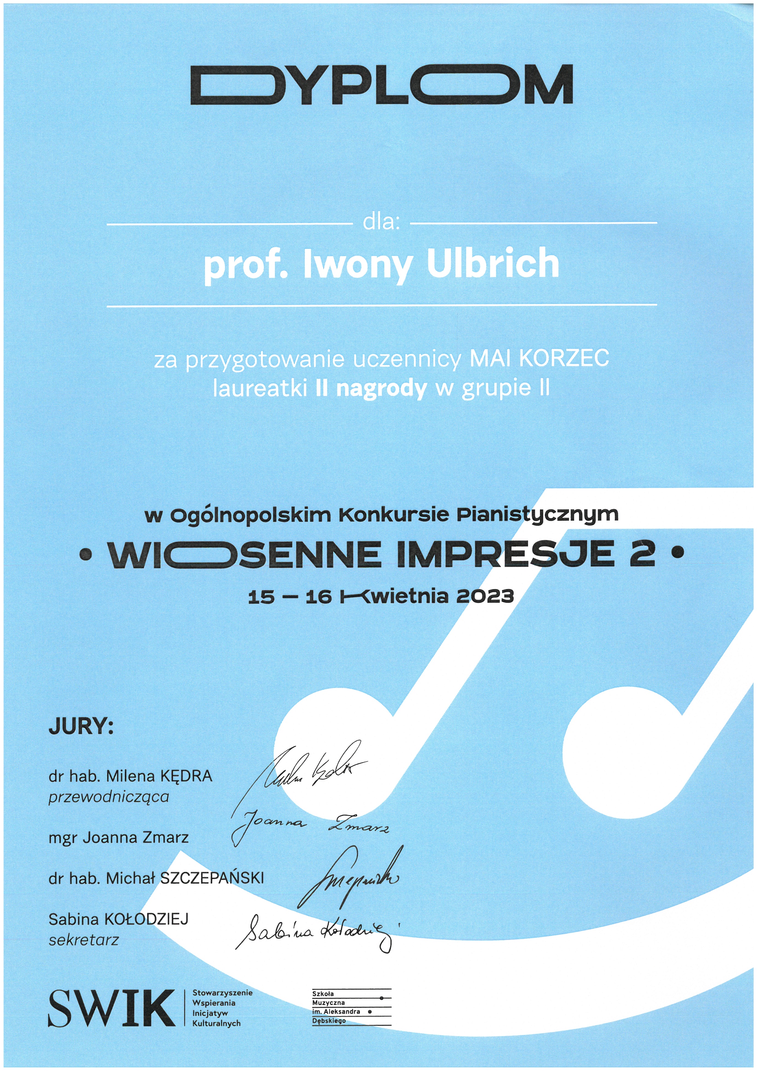 Maja Korzec, uczennica klasy fortepianu Pani Iwony Ulbrich zdobyła II miejsce w Ogólnopolskim Konkursie Pianistycznym „WIOSENNE IMPRESJE 2”, który odbył się w Krakowie w dniach 15-16 kwietnia 2023r.