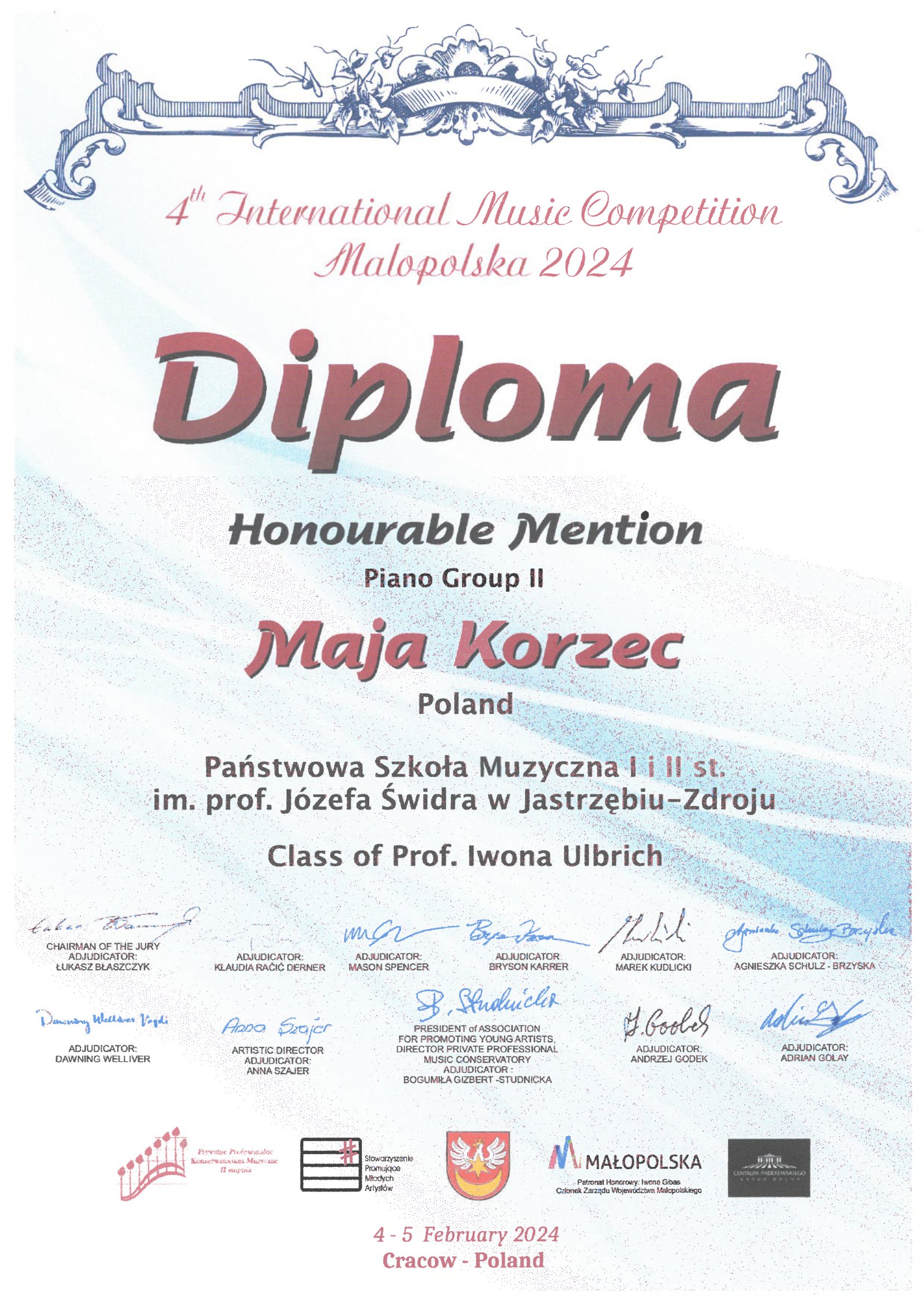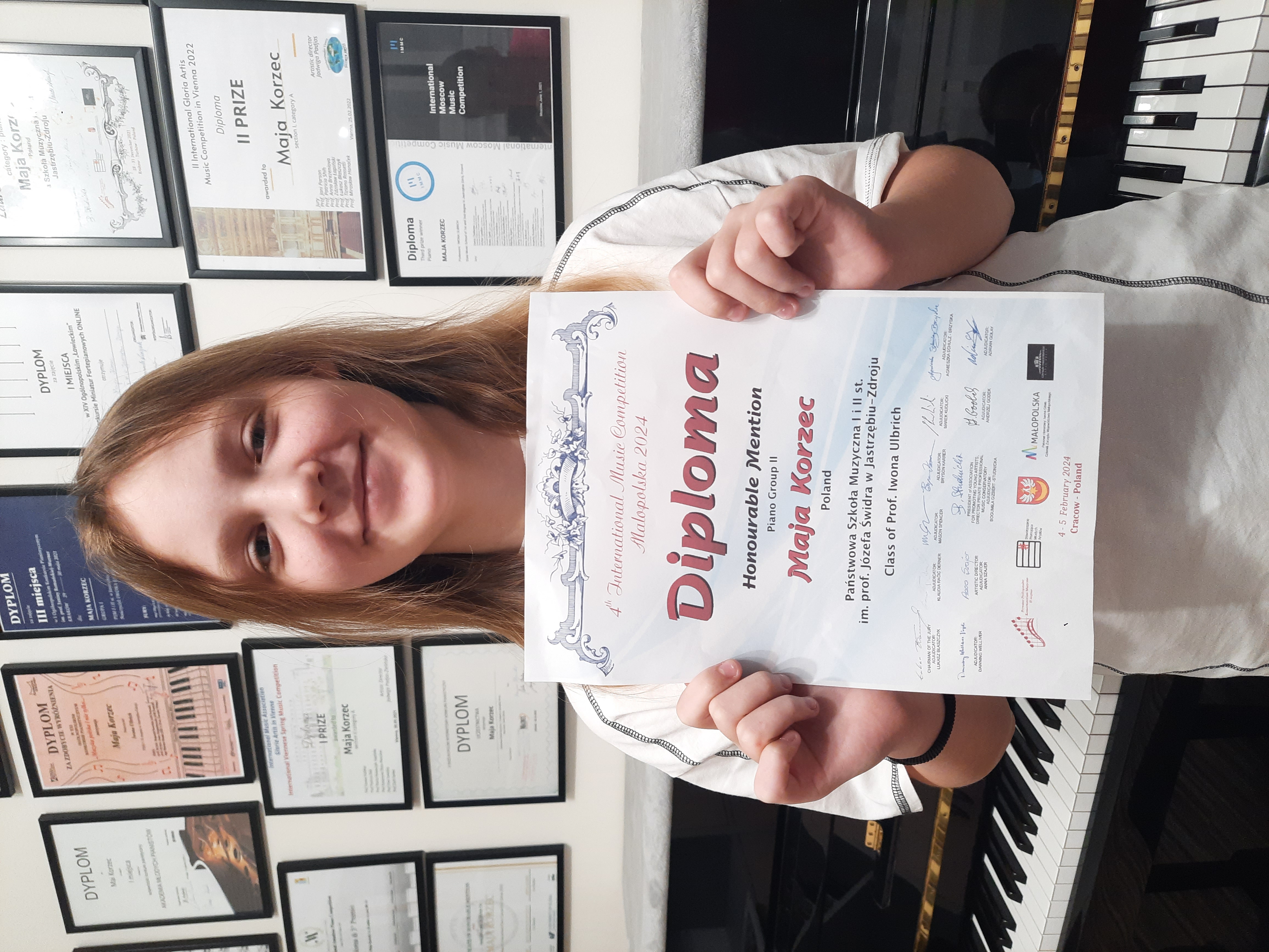 Maja Korzec z klasy fortepianu Pani Iwony Ulbrich otrzymała wyróżnienie w IV Międzynarodowym Konkursie Muzycznym "Małopolska 2024", który odbył się w dniach 4-5.02.2024 r. w Krakowie, w formie online.