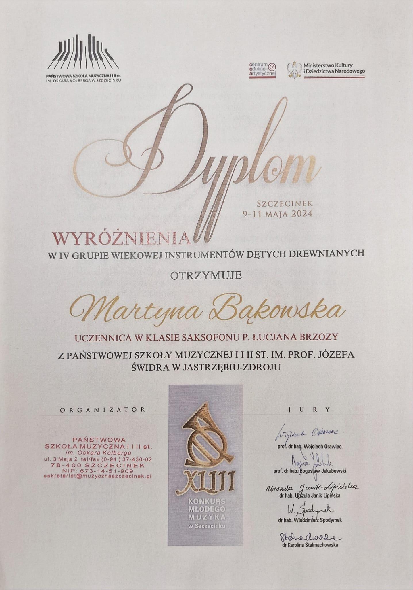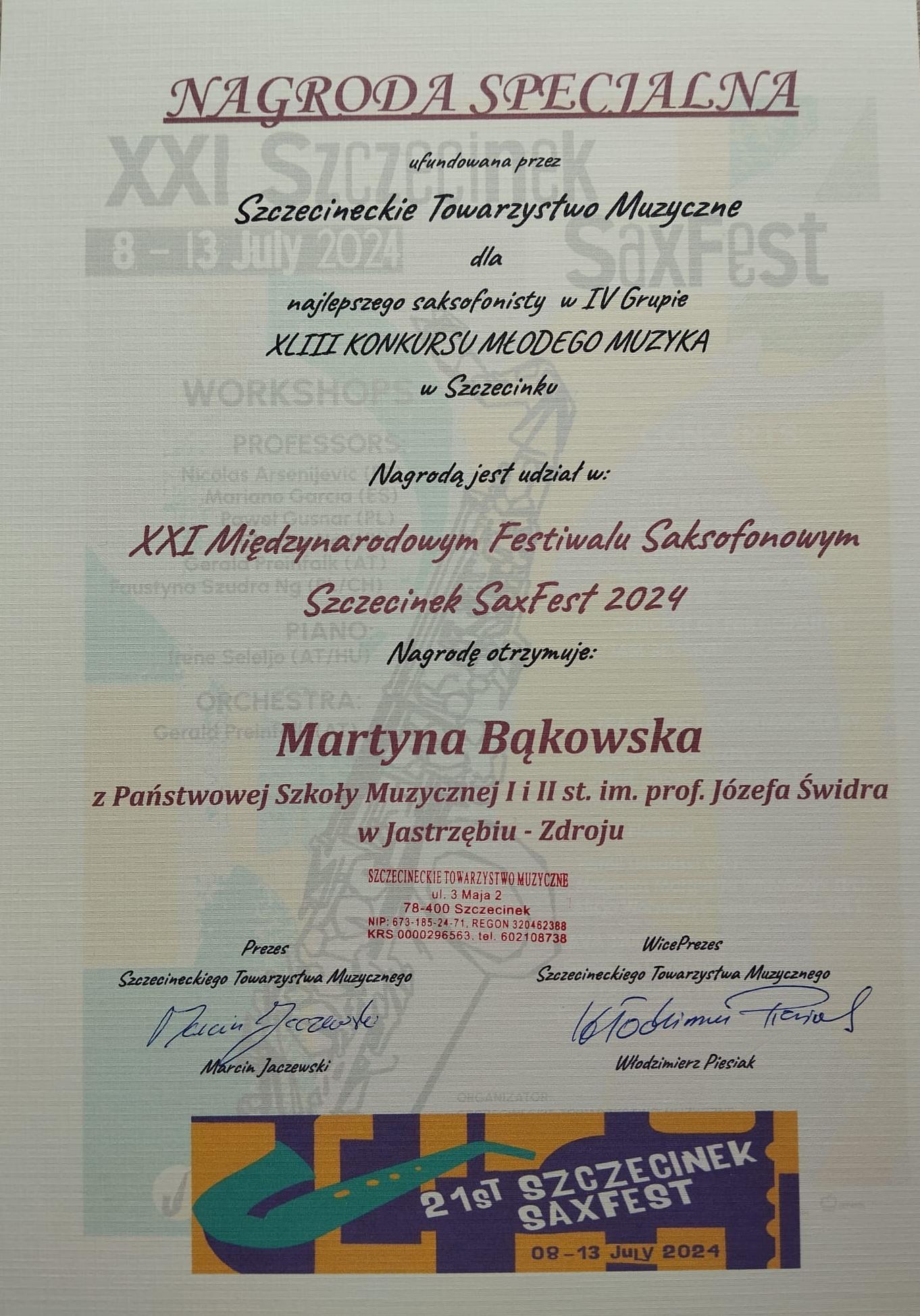 - WYRÓŻNIENIE i NAGRODA SPECJALNA - XLIII Konkurs Młodego Muzyka w Szczecinku, 9-11.05.2024 r.