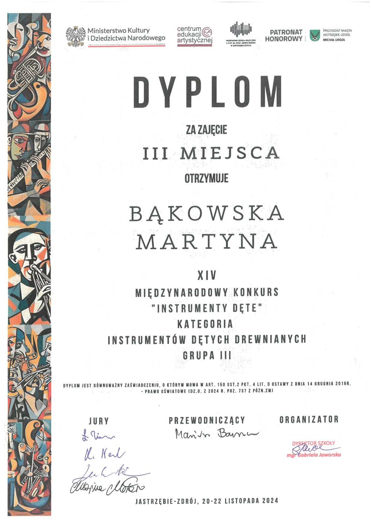 - III MIEJSCE - XIV Międzynarodowy Konkurs „Instrumenty Dęte” w Jastrzębiu-Zdroju, kategoria instrumentów dętych drewnianych (grupa III), 20 - 22.11.2024 r.