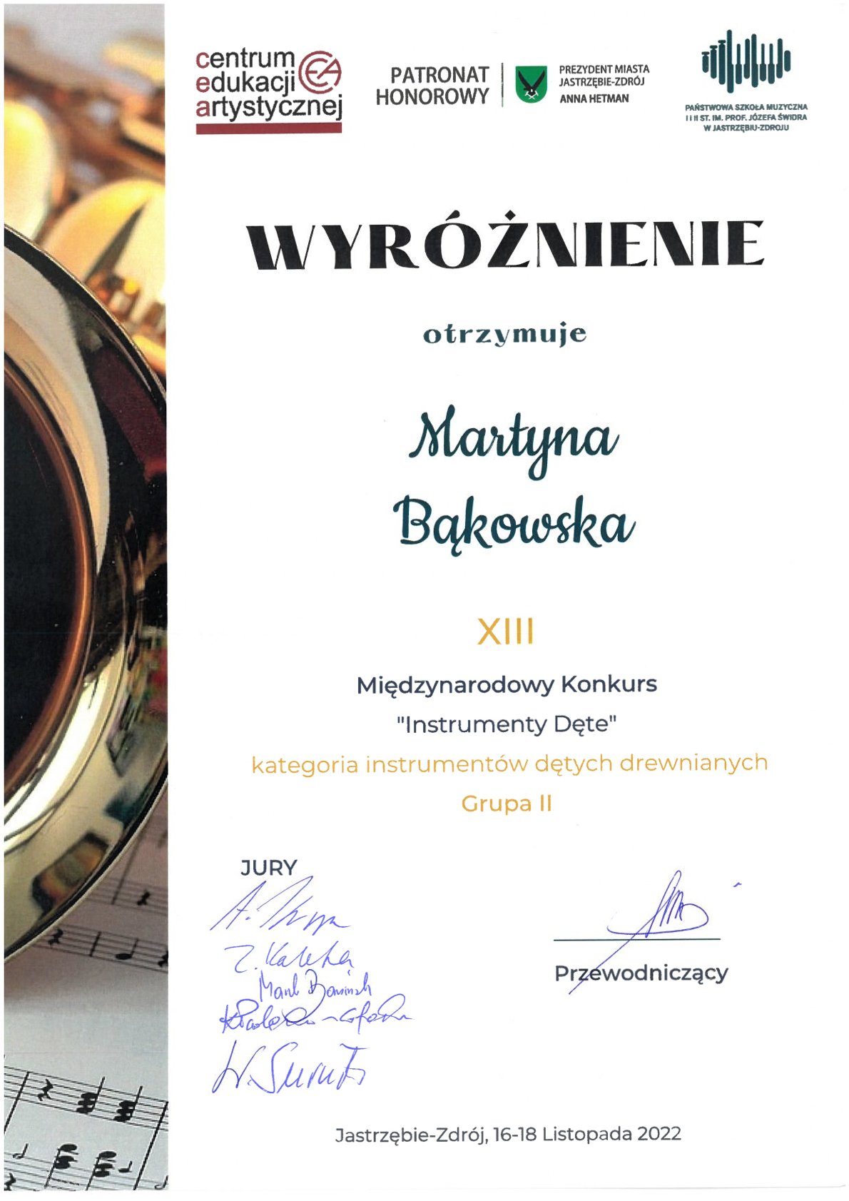 - WYRÓŻNIENIE - XIII Międzynarodowy Konkurs „Instrumenty Dęte” w Jastrzębiu-Zdroju, - kategoria instrumentów dętych drewnianych (grupa II), 16-18.11.2022 r.