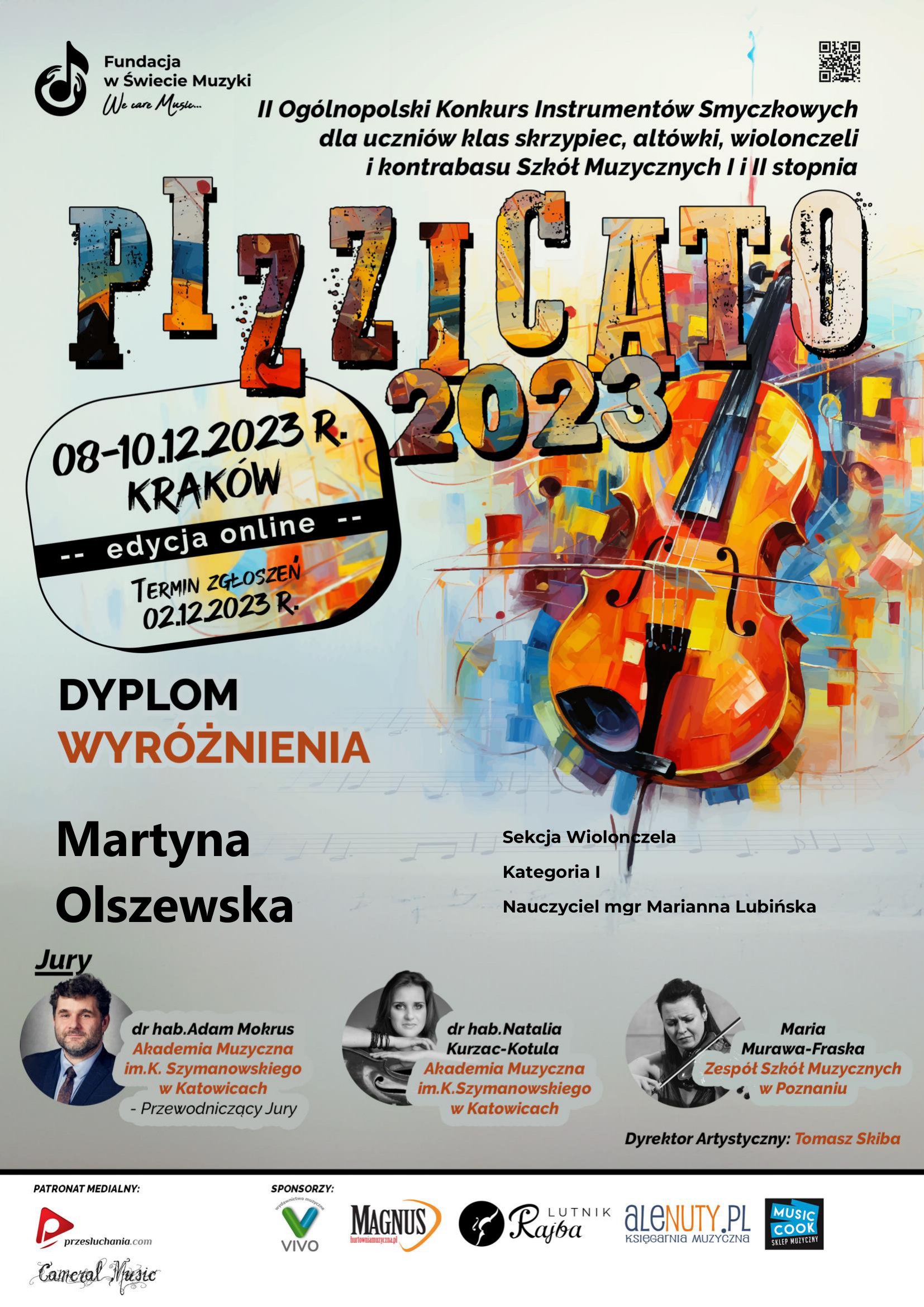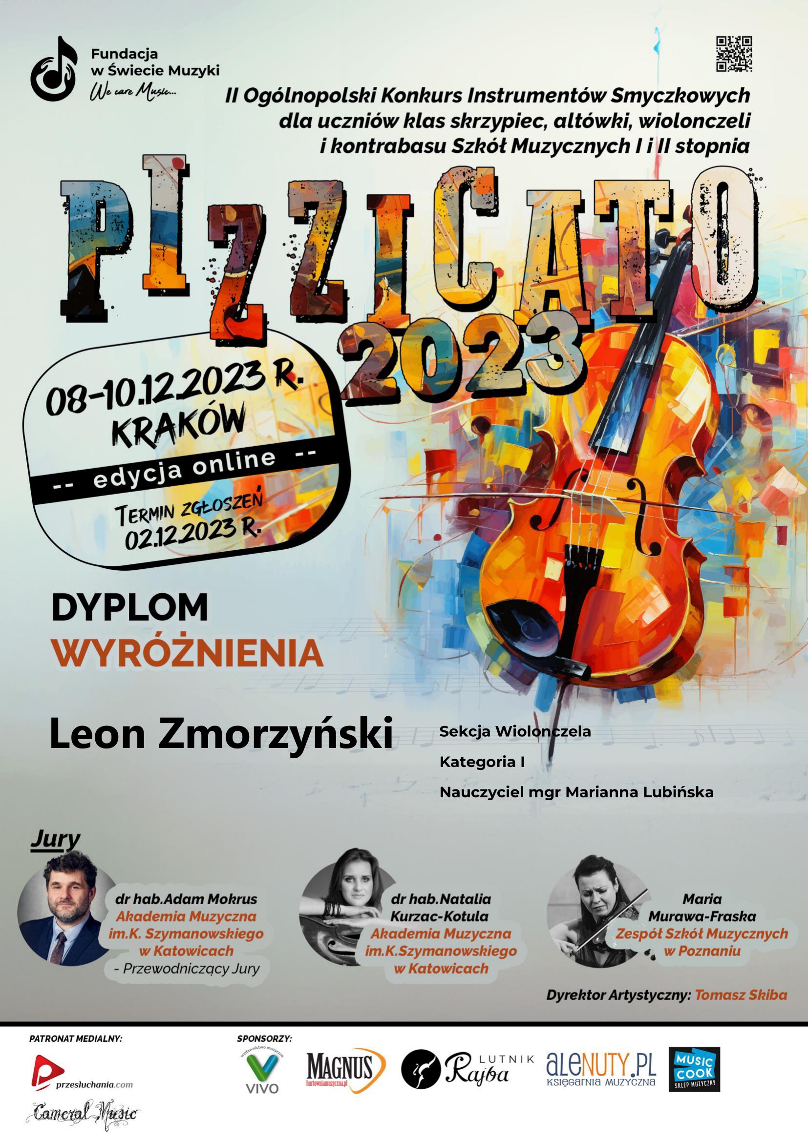 Nasi młodzi uczniowie sekcji instrumentów smyczkowych i szarpanych odnieśli sukces w II Ogólnopolskim Konkursie Instrumentów Smyczkowych dla uczniów klas skrzypiec, altówki, wiolonczeli i kontrabasu Szkół Muzycznych I i II stopnia "PIZZICATO", który odbył się w dniach 08-10 grudnia 2023 r. w Krakowie w formie online.