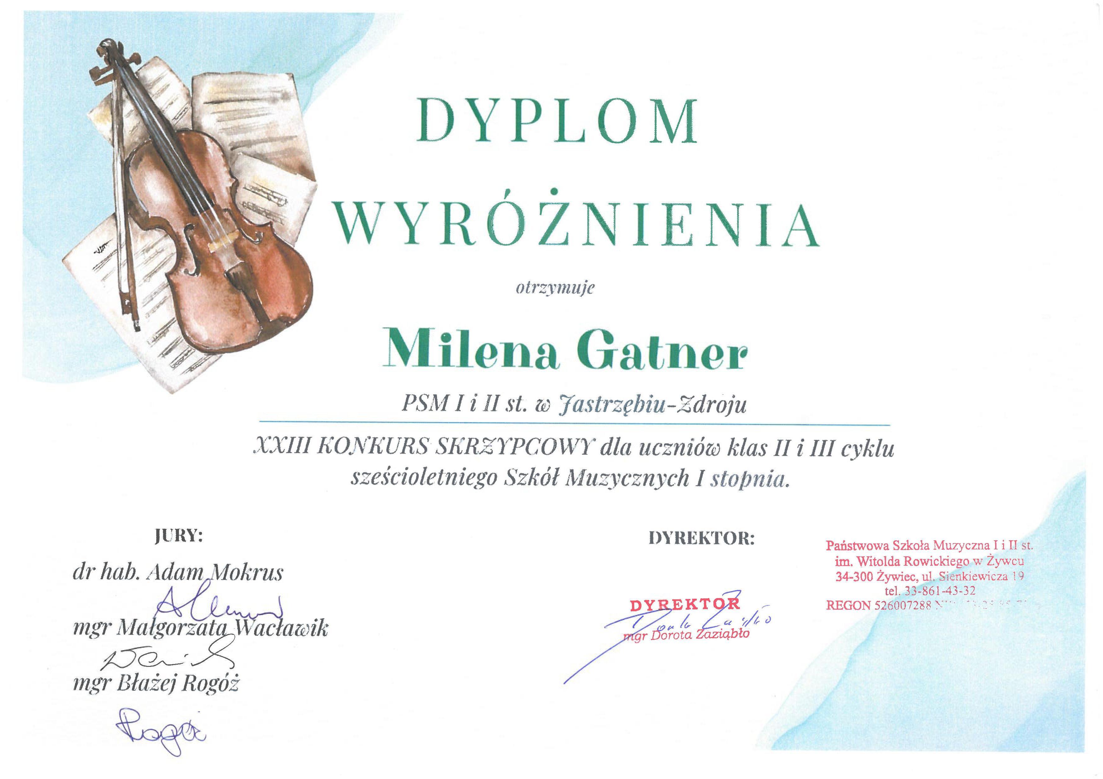 - WYRÓŻNIENIE - XXIII Konkurs Skrzypcowy dla uczniów klas II i III cyklu sześcioletniego Szkół Muzycznych I stopnia, Żywiec, 9.05.2024 r.