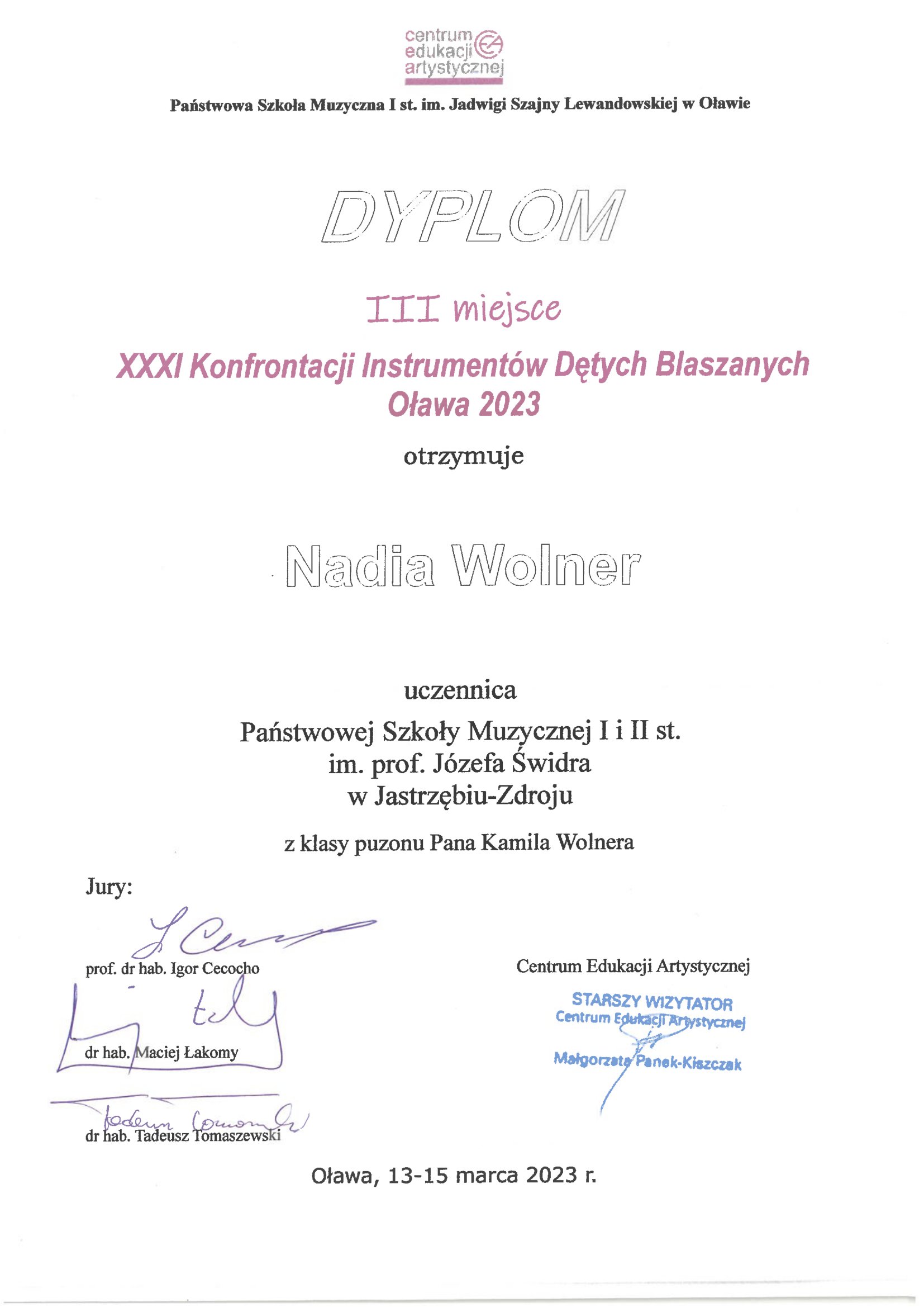 - III MIEJSCE - XXXI Konfrontacje Instrumentów Dętych Blaszanych w Oławie, 13-15.03.2023 r.