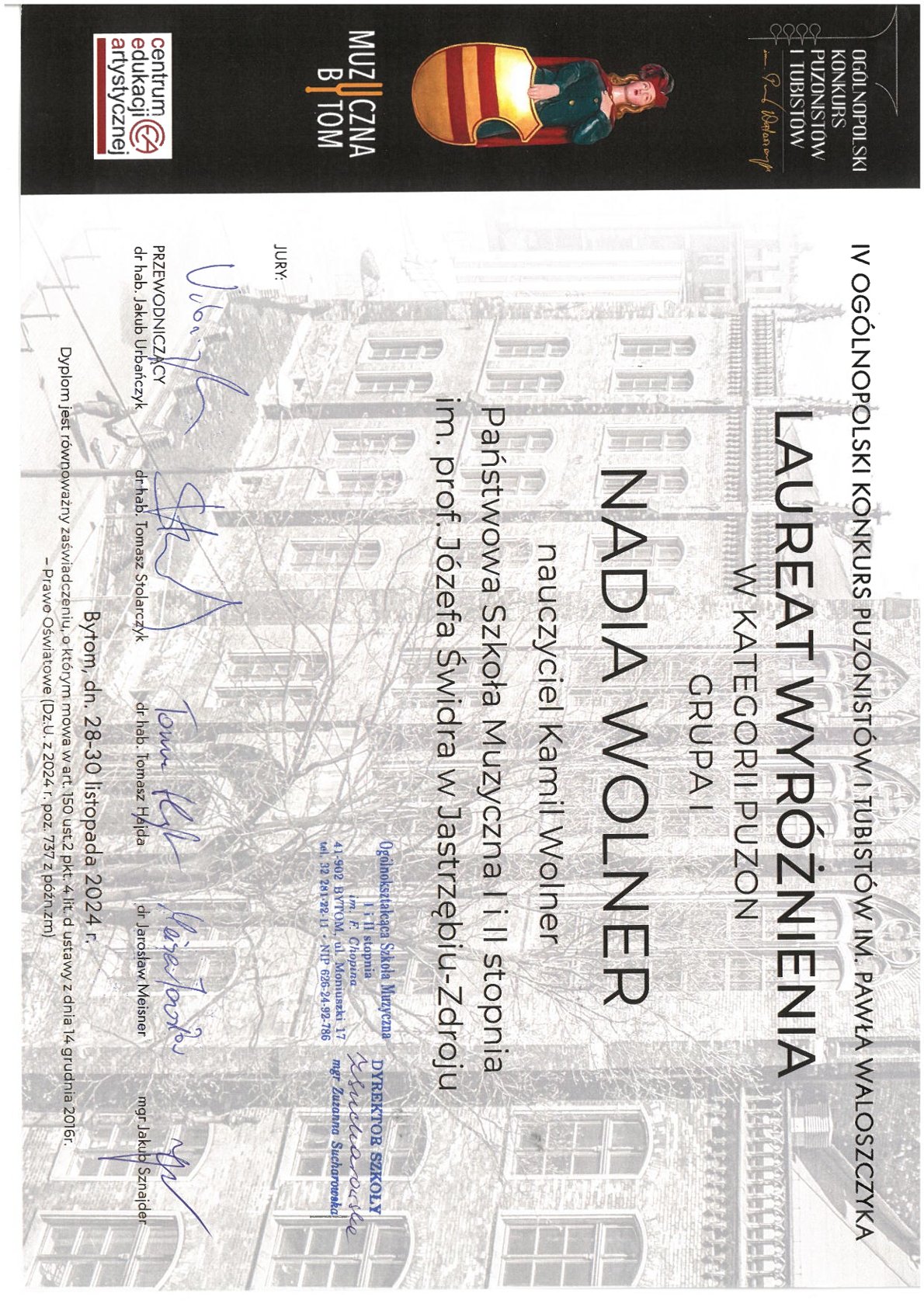 - WYRÓŻNIENIE - IV Ogólnopolski Konkurs Puzonistów i Tubistów im. Pawła Waloszczyka, Bytom, 28-30.11.2024 r.