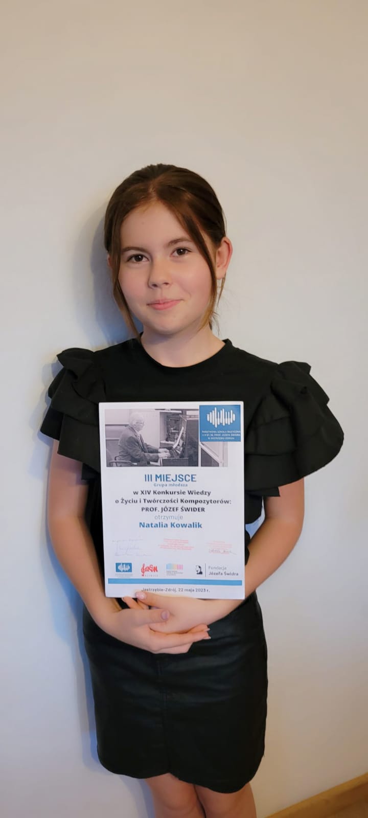 - III MIEJSCE - XIV Konkurs Wiedzy o Życiu i Twórczości Kompozytorów: prof. Józef Świder w Jastrzębiu-Zdroju, 22.05.2023 r. - grupa młodsza, przygotowanie mgr Gabriela Jaworska