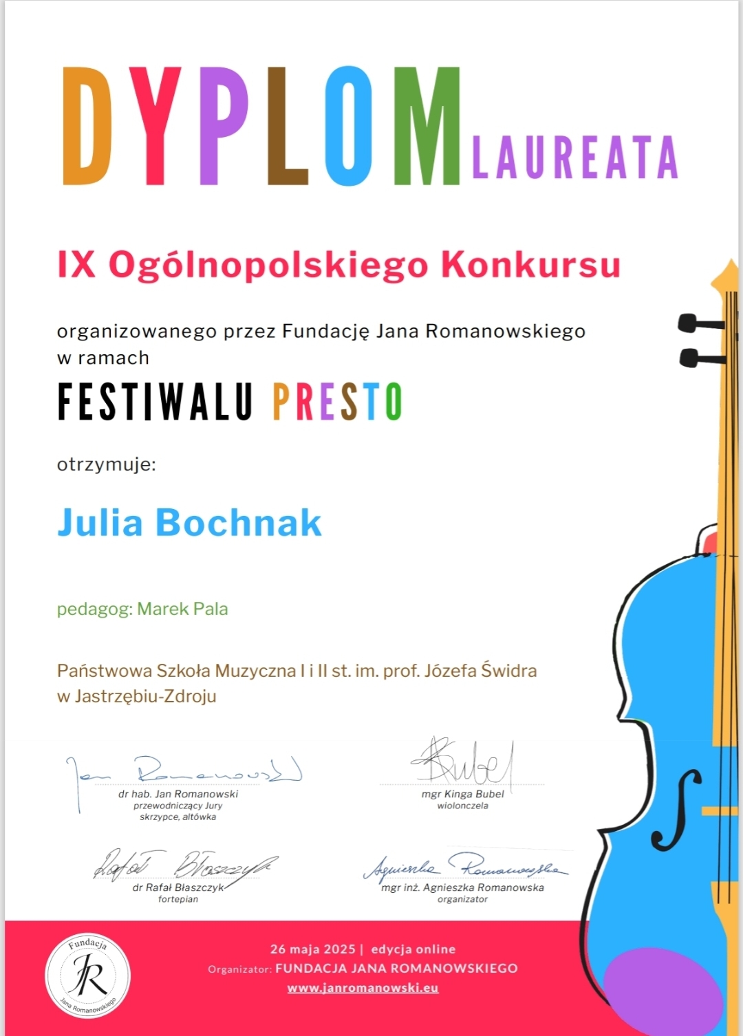 Z radością informujemy, że w IX Ogólnopolskim Konkursie organizowanym przez Fundację Jana Romanowskiego w ramach Festiwalu Presto, nasze uczennice odniosły znaczące sukcesy: