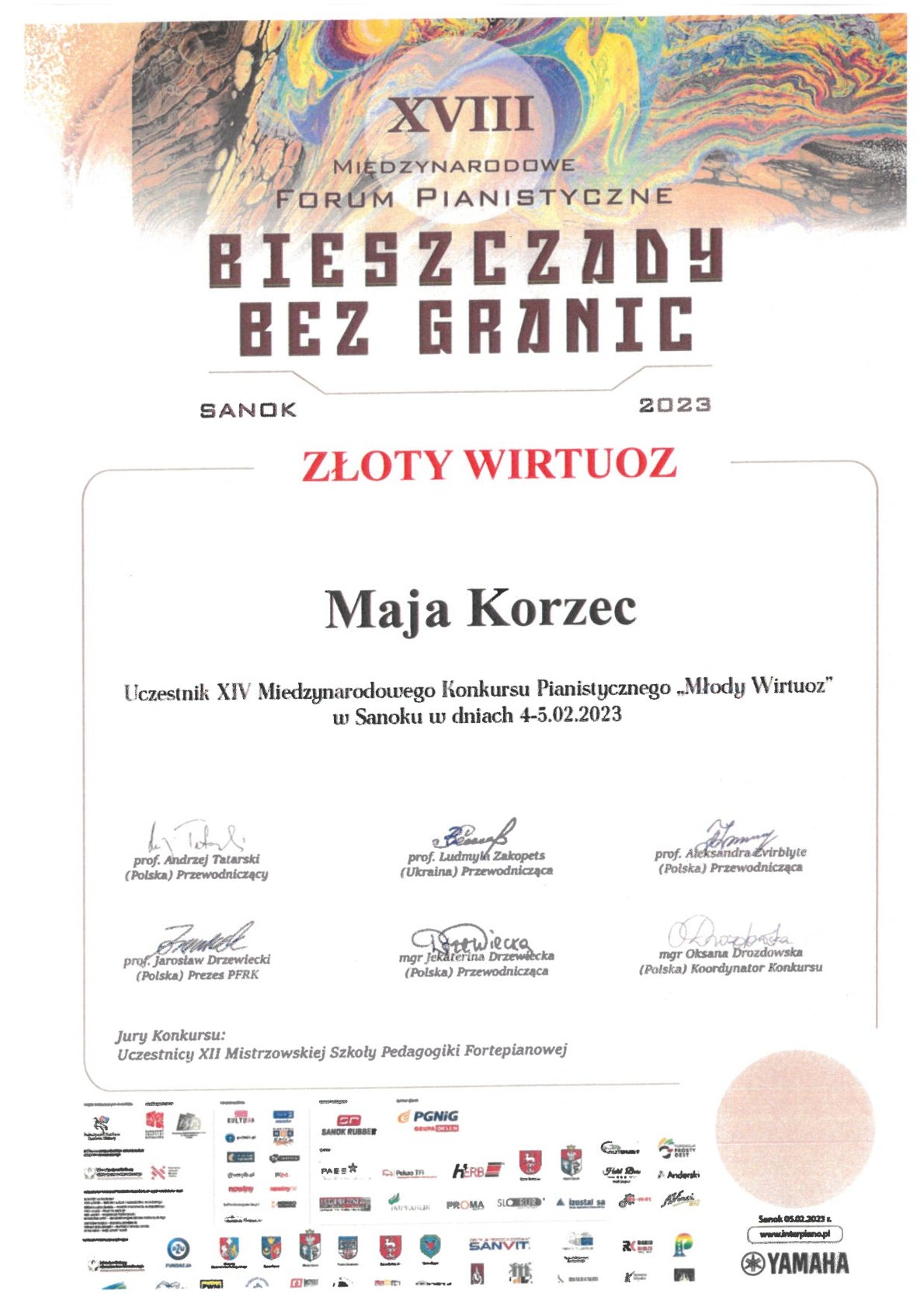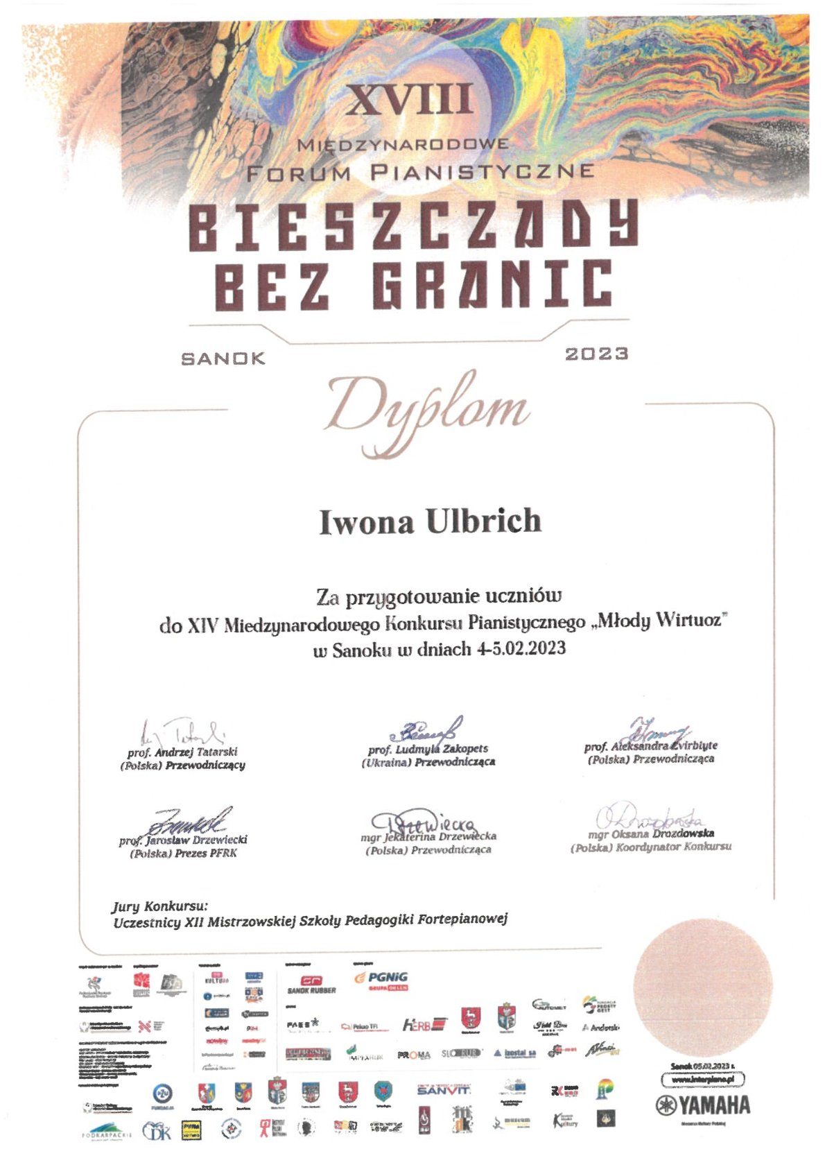 - I NAGRODA – ŁUCJA DĄBKOWSKA z klasy fortepianu mgr Iwony Ulbrich – III kategoria wiekowa - XIV Międzynarodowy Konkurs Pianistyczny „Młody Wirtuoz” w Sanoku, 4-5.02.2023 r. Organizator: XVIII Międzynarodowe Forum Pianistyczne BIESZCZADY BEZ GRANIC