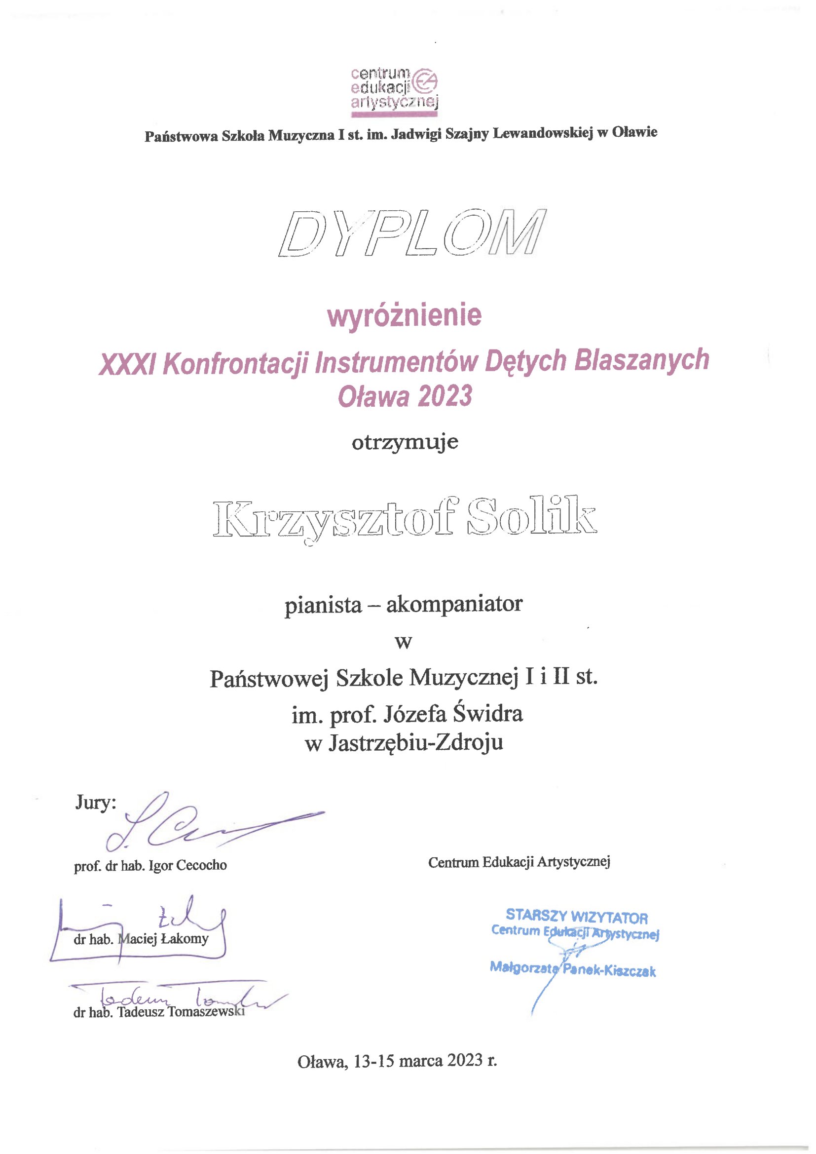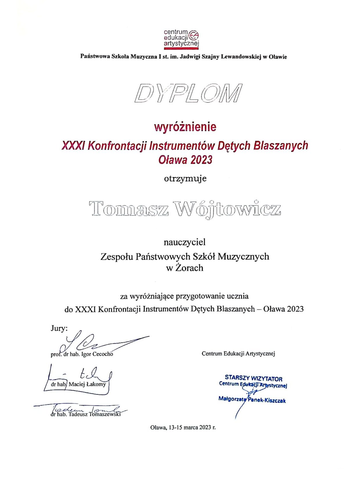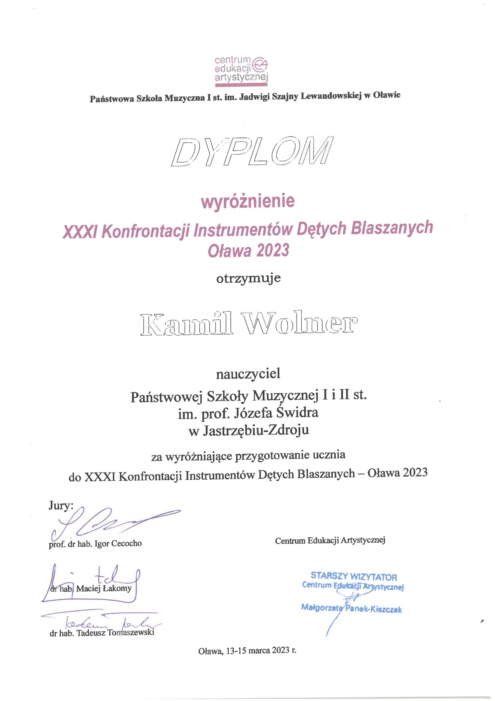 - WYRÓŻNIENIE – SZYMON WALA z klasy trąbki mgra Joachima Paczyńskiego – kategoria instrumentów dętych blaszanych (grupa I)
