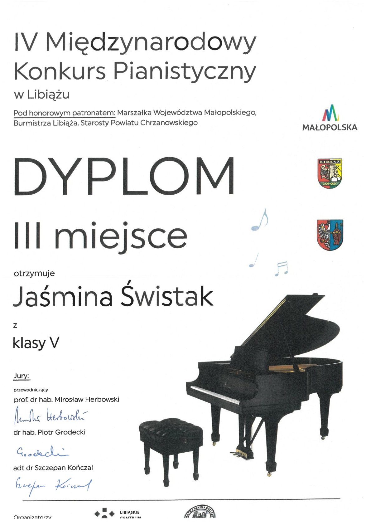 - III MIEJSCE – JAŚMINA ŚWISTAK z klasy fortepianu dr hab. Anny Miech