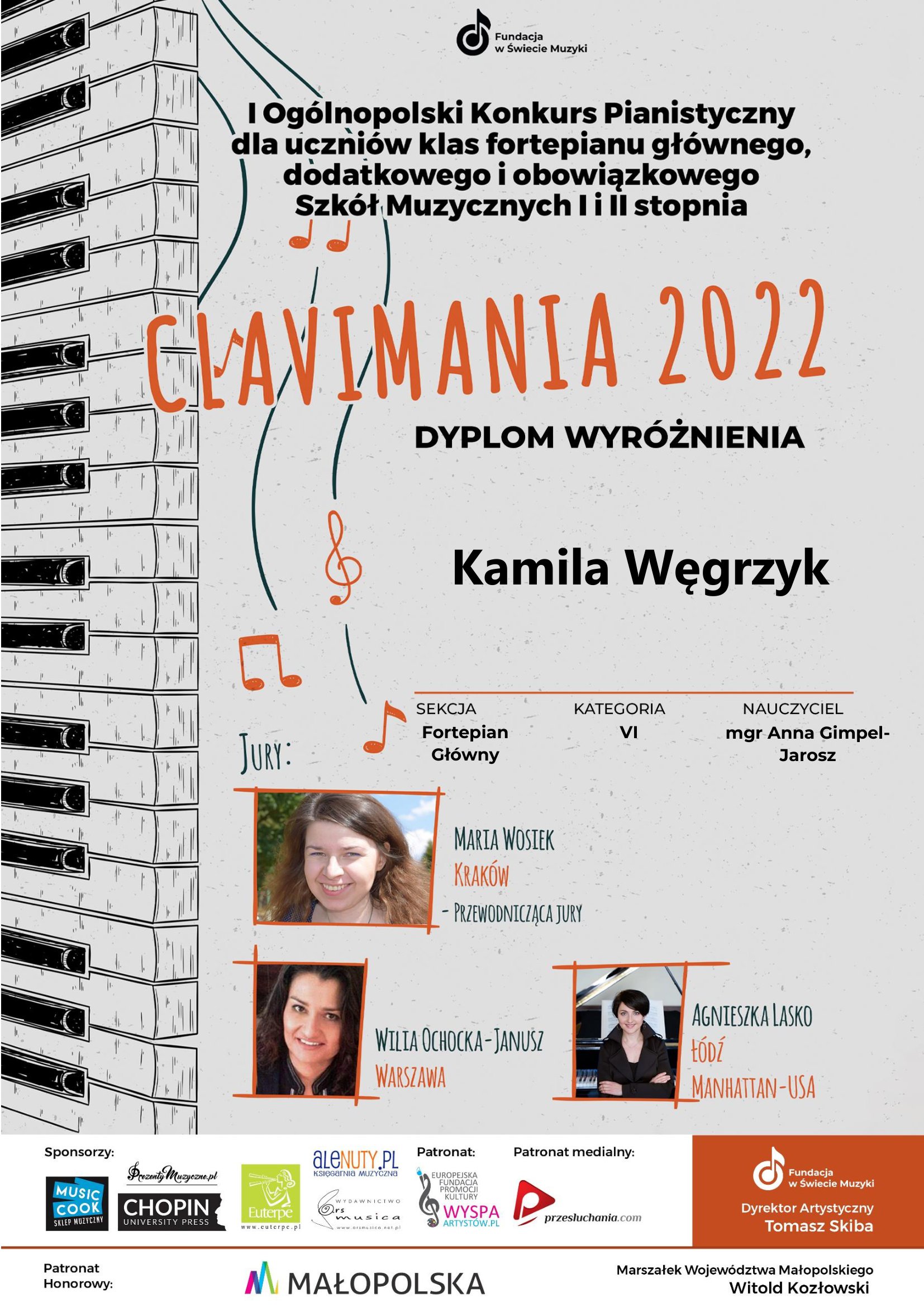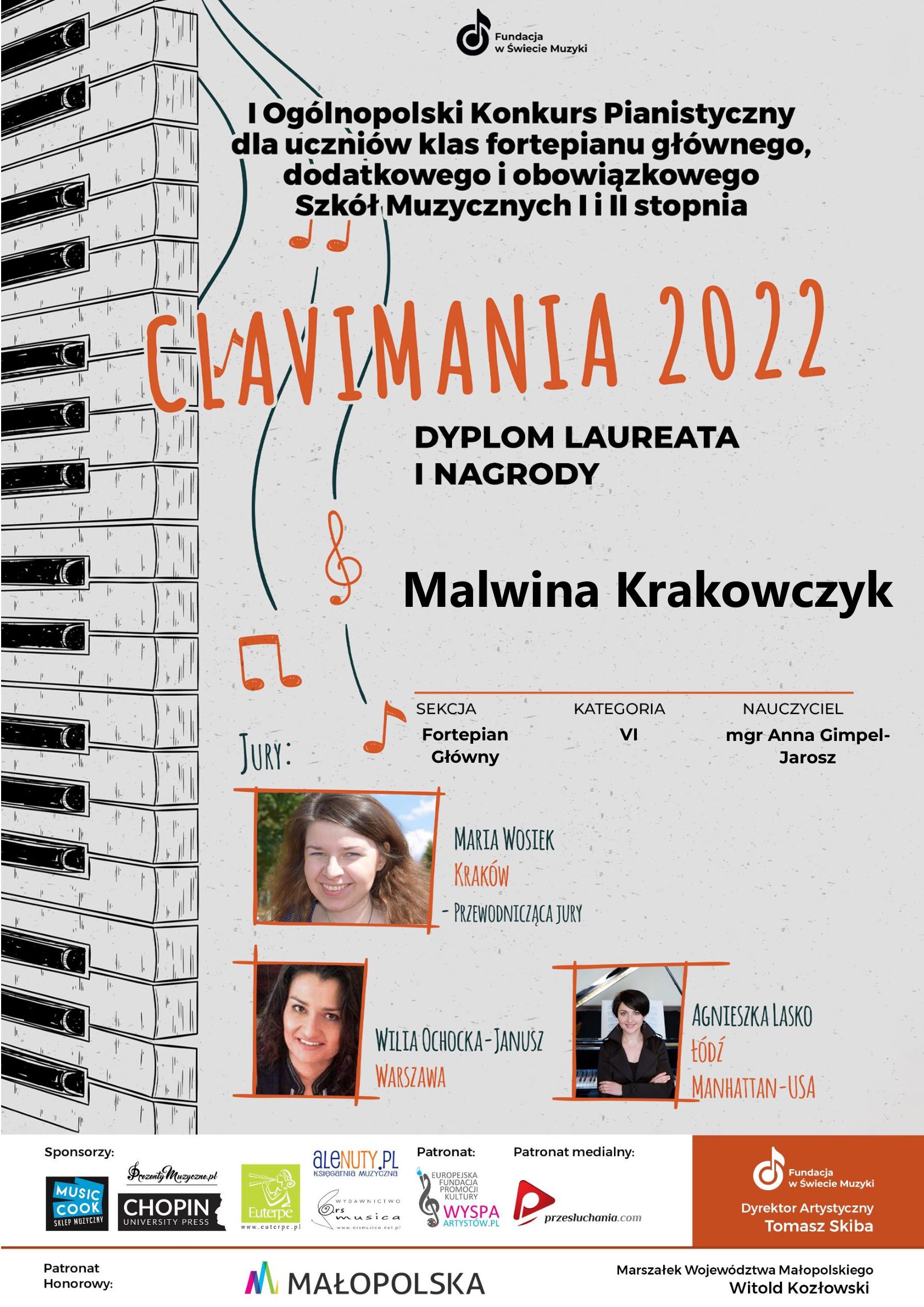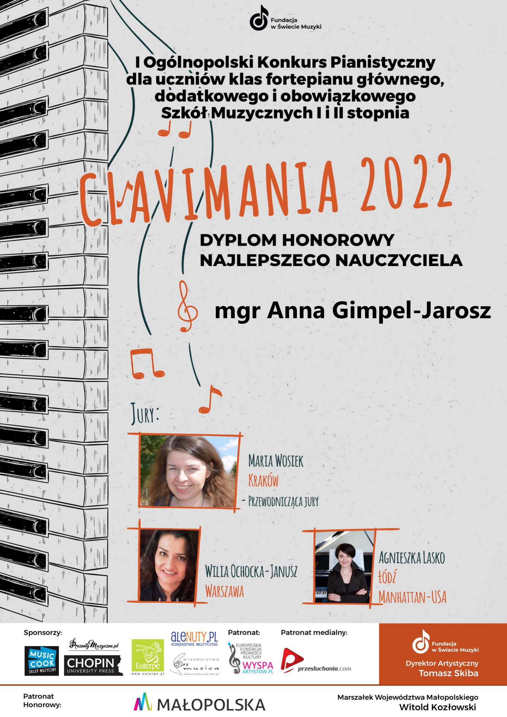 - I Ogólnopolski Konkurs Pianistyczny dla uczniów klas fortepianu głównego, dodatkowego iobowiązkowego Clavimania 2022 w Krakowie, 15-16.12.2023 r.