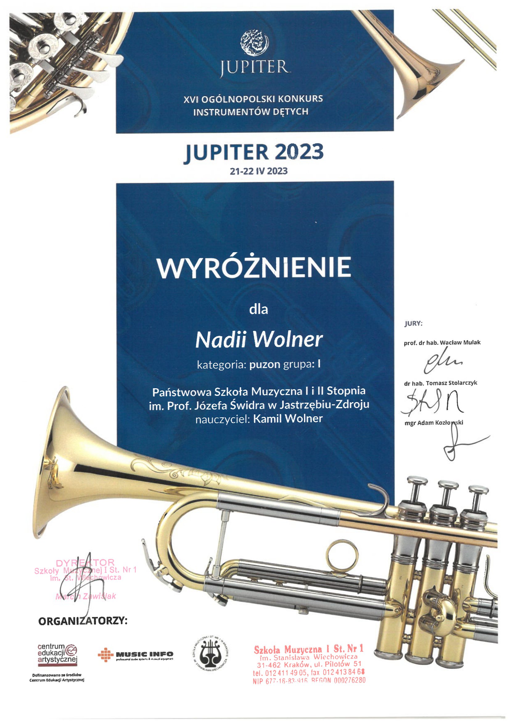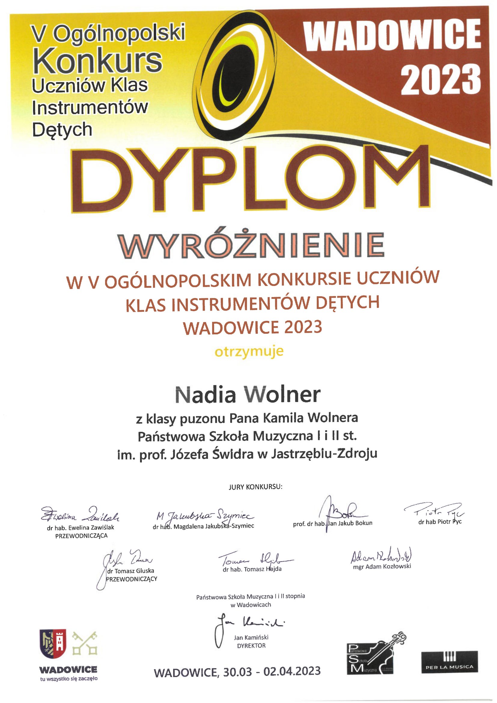 - WYRÓŻNIENIE – NADIA WOLNER z klasy puzonu mgra Kamila Wolnera -
