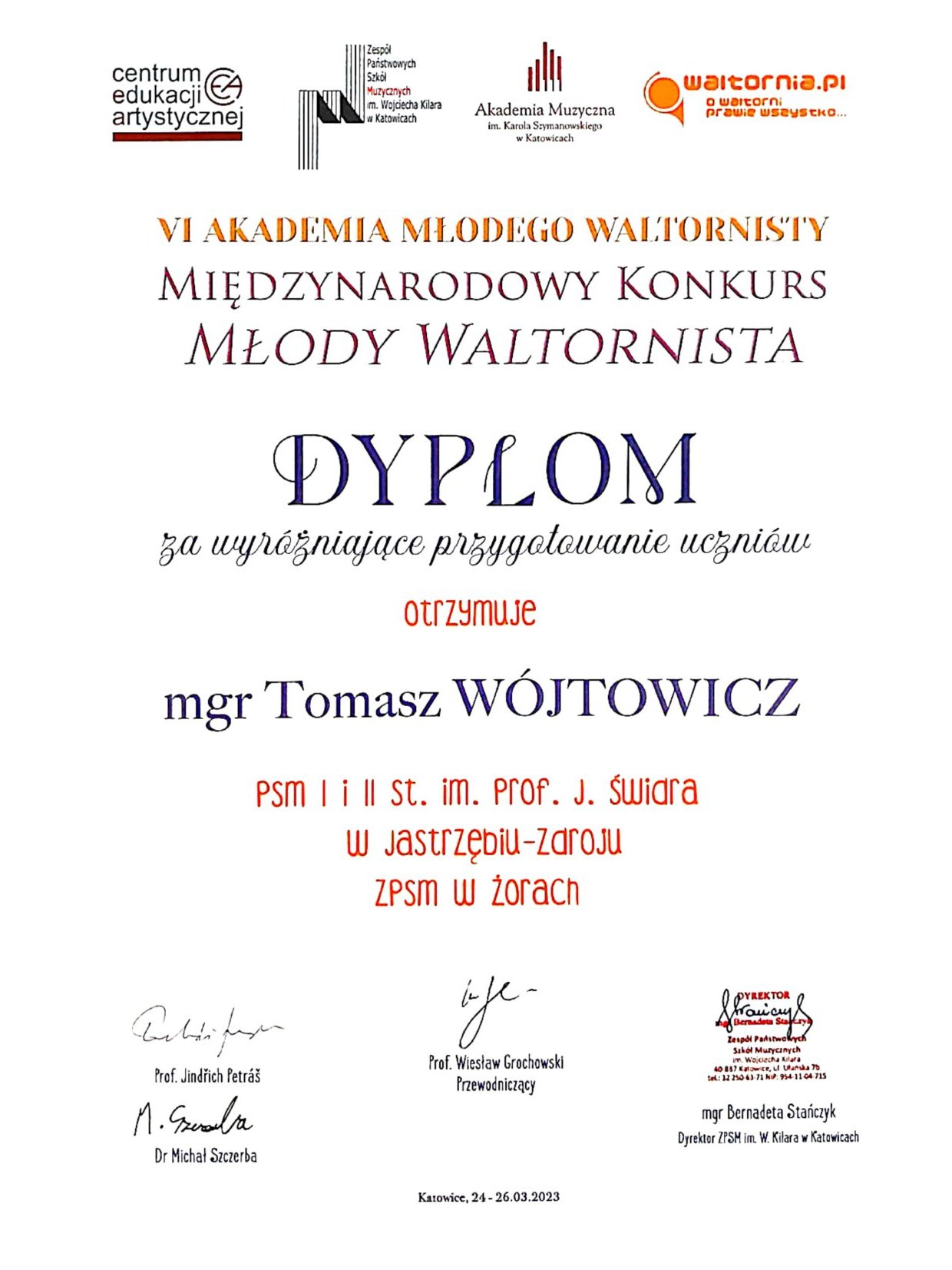 - WYRÓŻNIENIE – KRZYSZTOF UHEREK z klasy waltorni mgr Tomasza Wójtowicza -