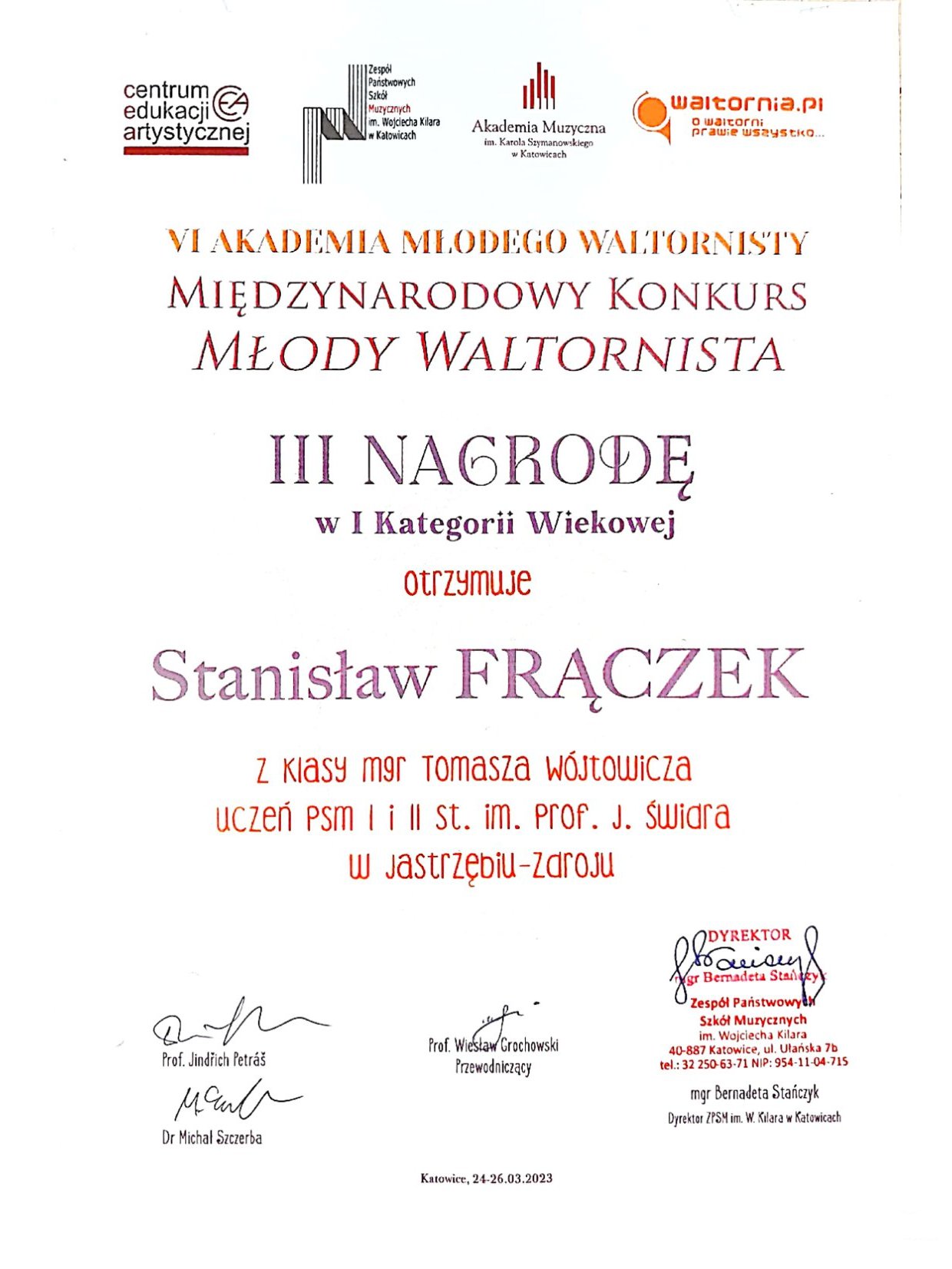 - III NAGRODA – STANISŁAW FRĄCZEK z klasy waltorni mgra Tomasza Wójtowicza – I kategoria wiekowa -