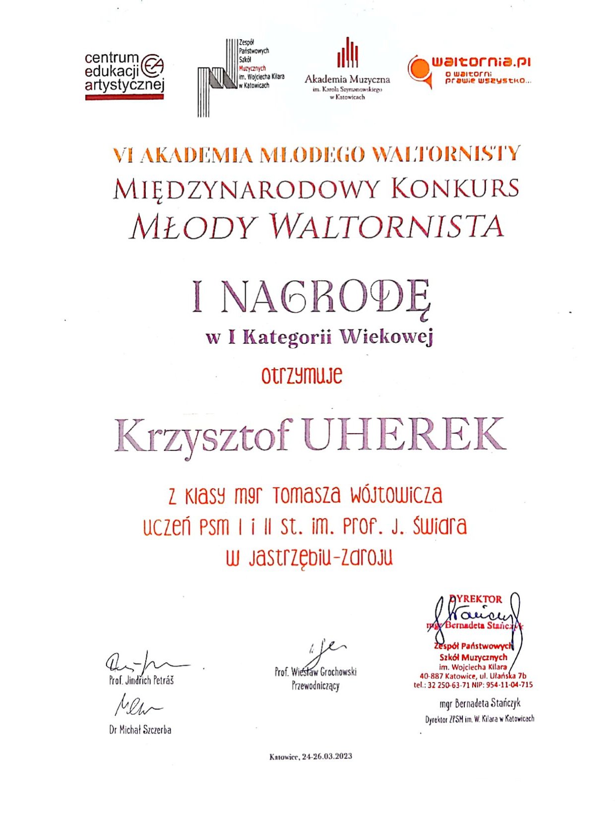 - I NAGRODA – KRZYSZTOF UHEREK z klasy waltorni mgra Tomasza Wójtowicza – I kategoria wiekowa