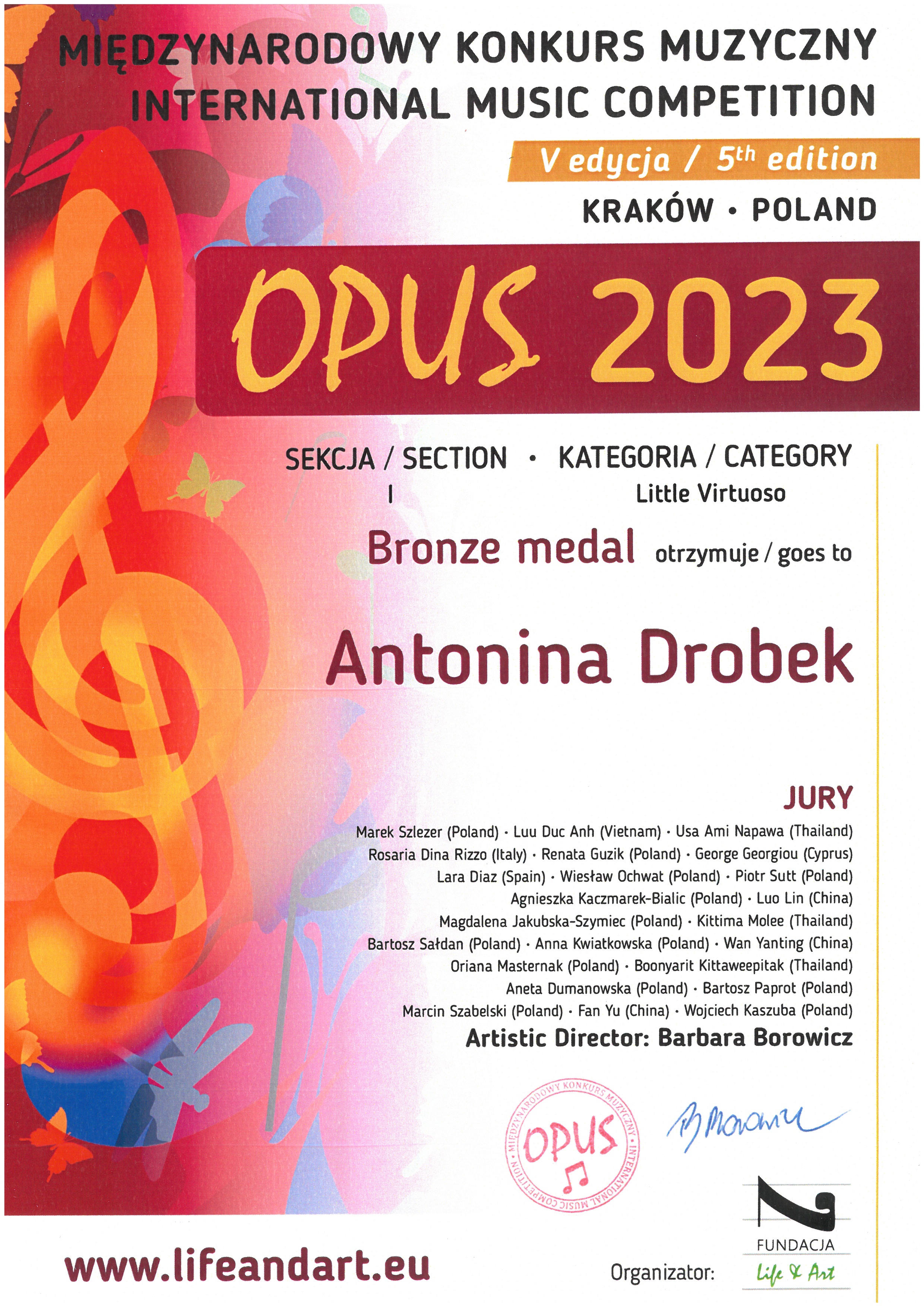 - BRĄZOWY MEDAL – Antonina Drobek z klasy fortepianu mgr Anny Gimpel-Jarosz – kategoria Mały Wirtuoz