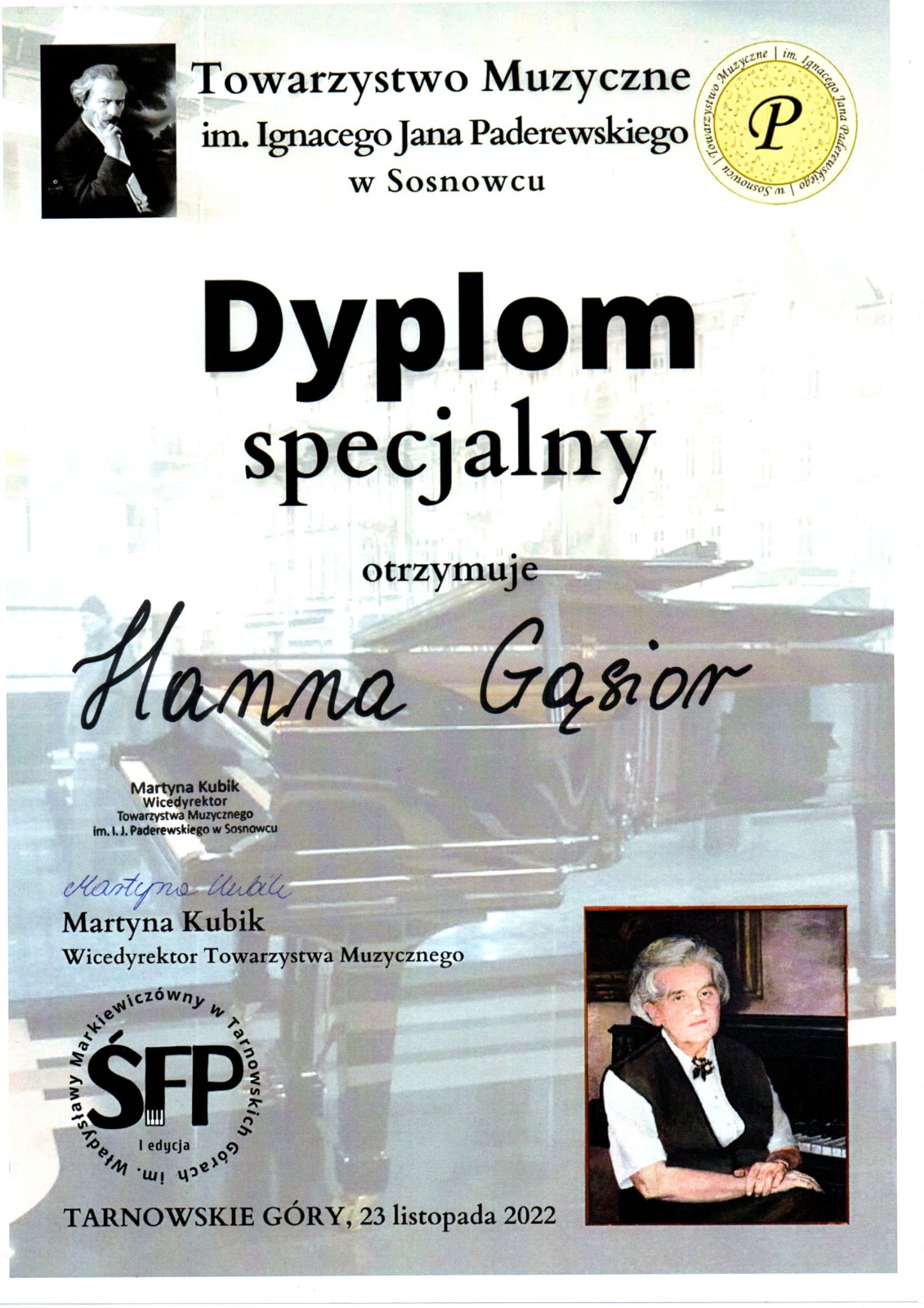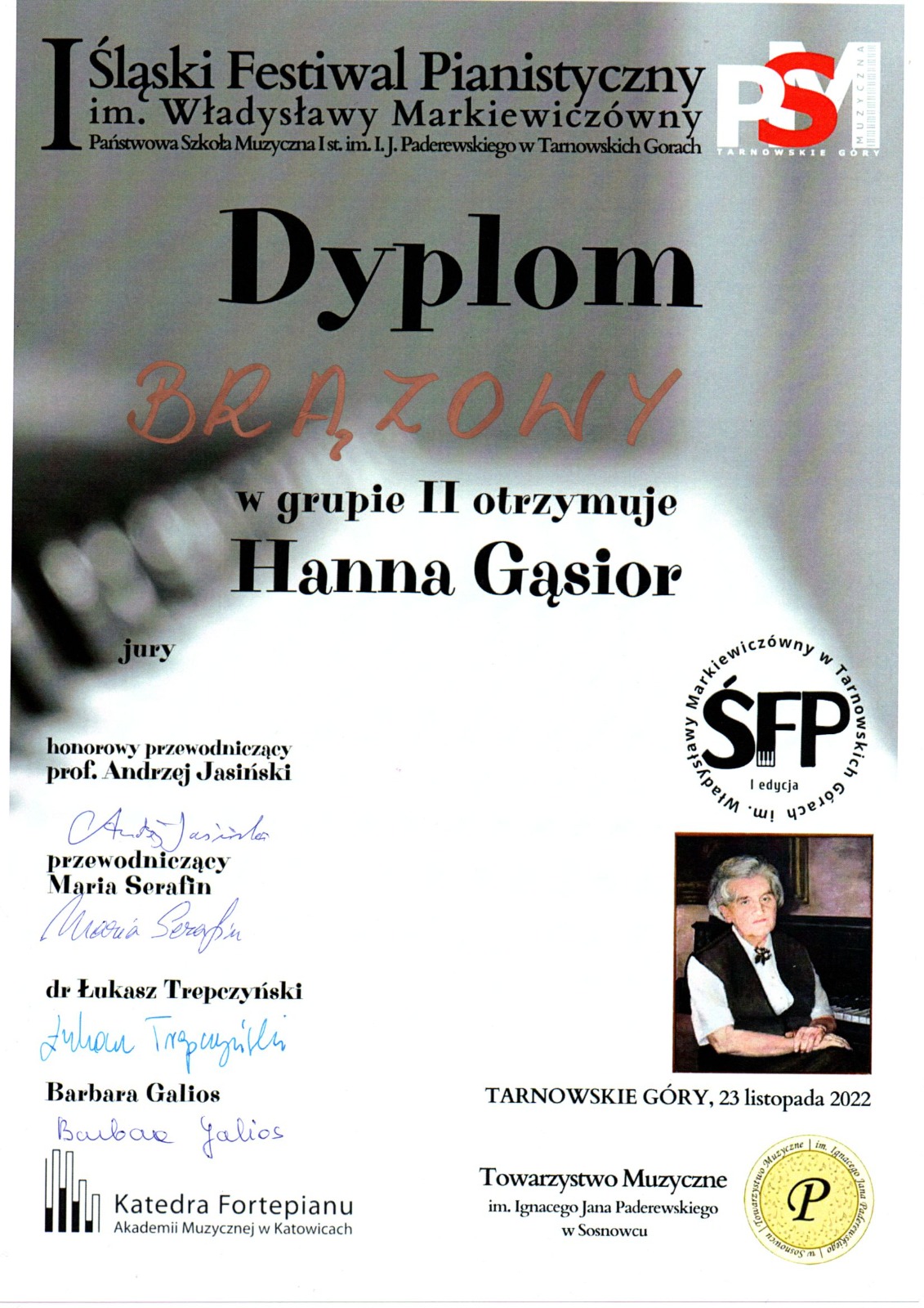 - BRĄZOWY DYPLOM i DYPLOM SPECJALNY - HANNA GĄSIOR z klasy fortepianu dr hab. Anny Miech - grupa II
