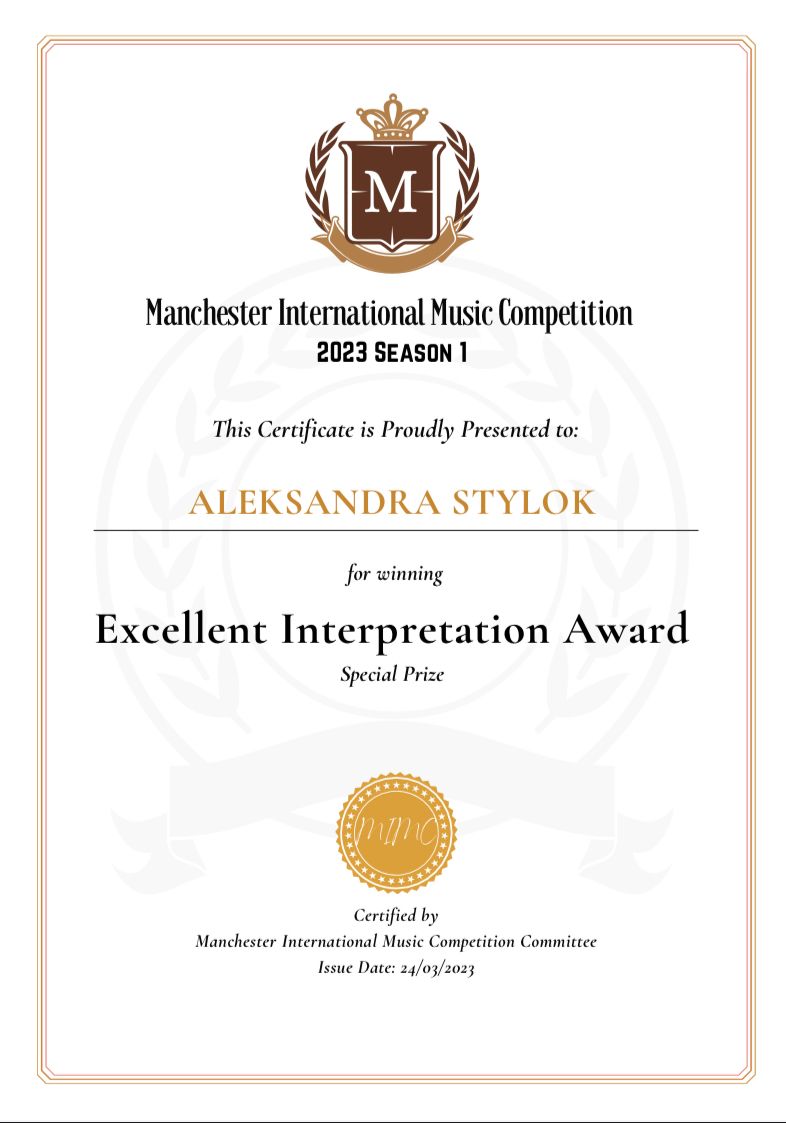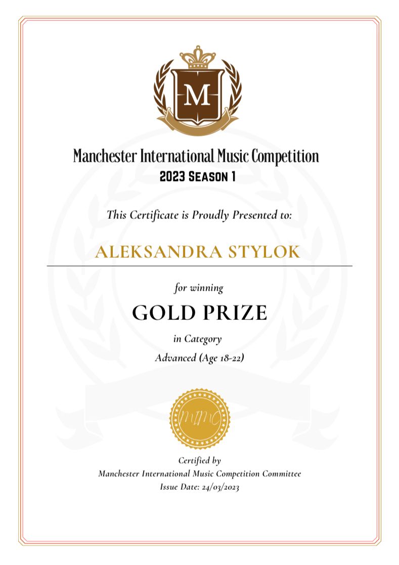 - PIERWSZE MIEJSCE - ALEKSANDRA STYLOK - World Grand Prix International Music Contest - kategoria Advanced (18-22)