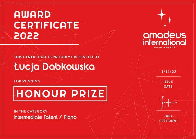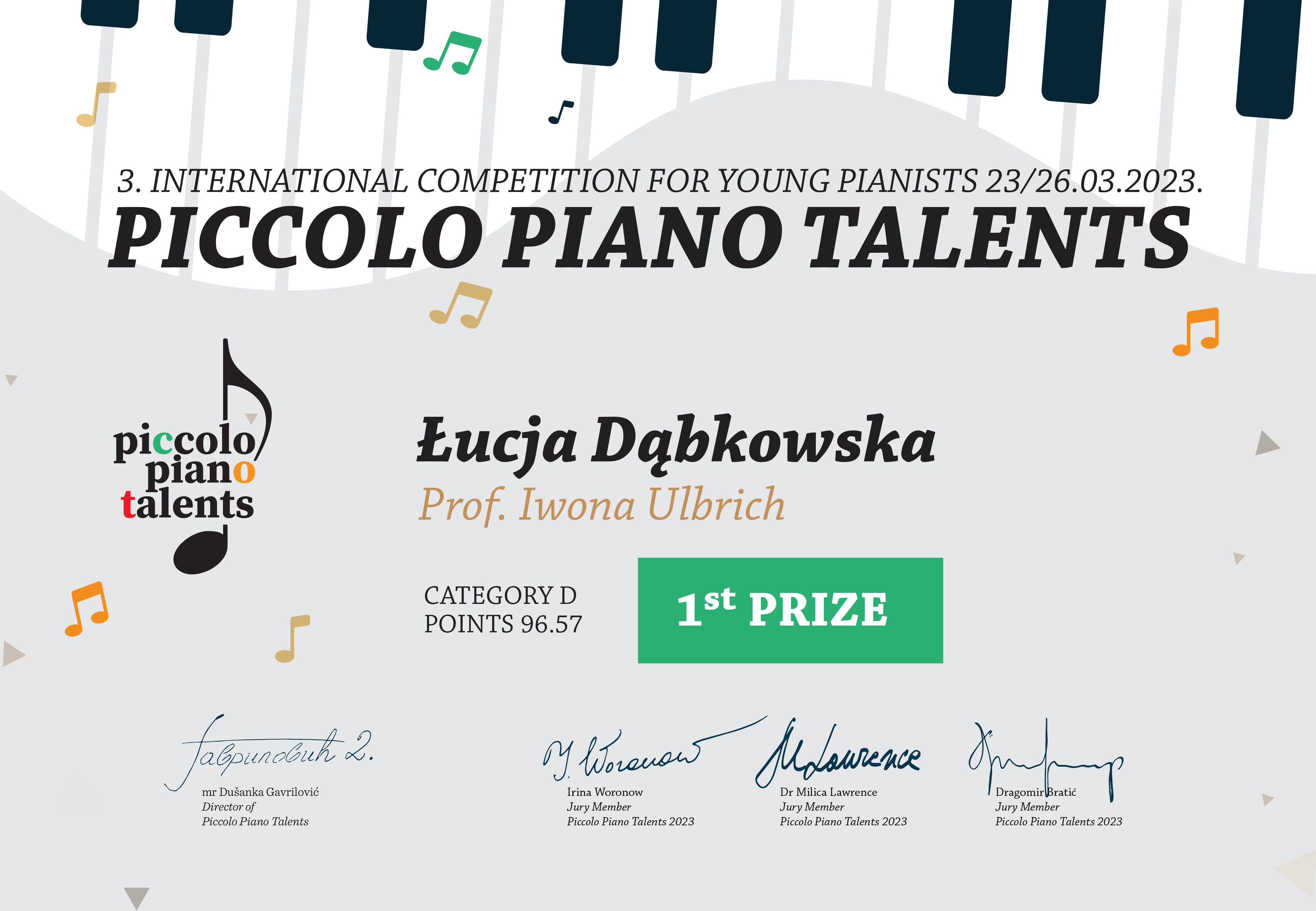 - NAGRODA HONOROWA – ŁUCJA DĄBKOWSKA z klasy fortepianu mgr Iwony Ulbrich - kategoria Intermediate Talent / Piano.