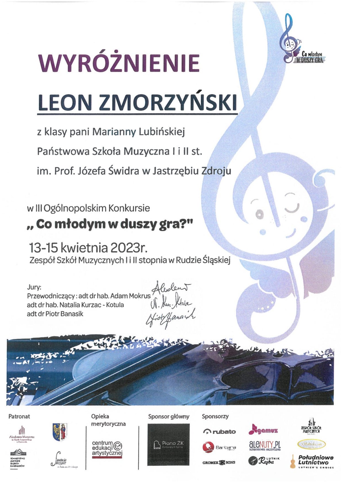- WYRÓŻNIENIE – LEON ZMORZYŃSKI z klasy wiolonczeli mgr Marianny Lubińskiej (grupa I)