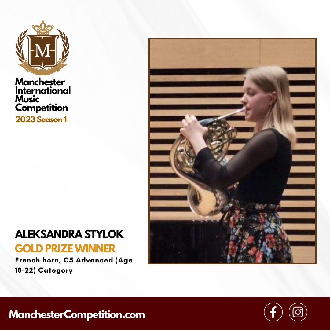 - GOLD PRIZE i NAGRODA SPECJALNA - ALEKSANDRA STYLOK z klasy waltornii mgra Tomasz Wójtowicza - kategoria Advanced (18-22) -