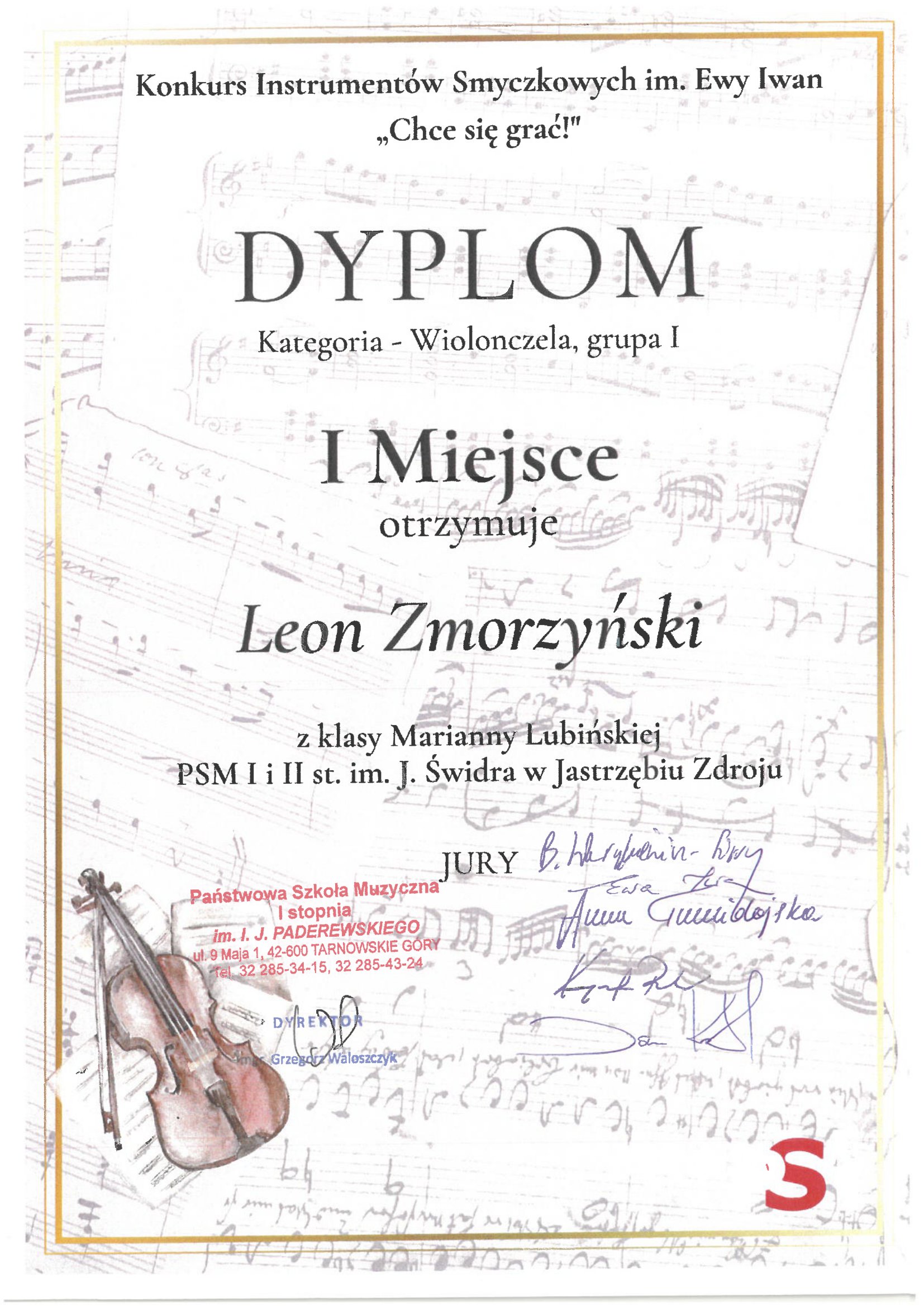 - I MIEJSCE – LEON ZMORZYŃSKI z klasy wiolonczeli mgr Marianny Lubińskiej – kategoria wiolonczela (grupa I)