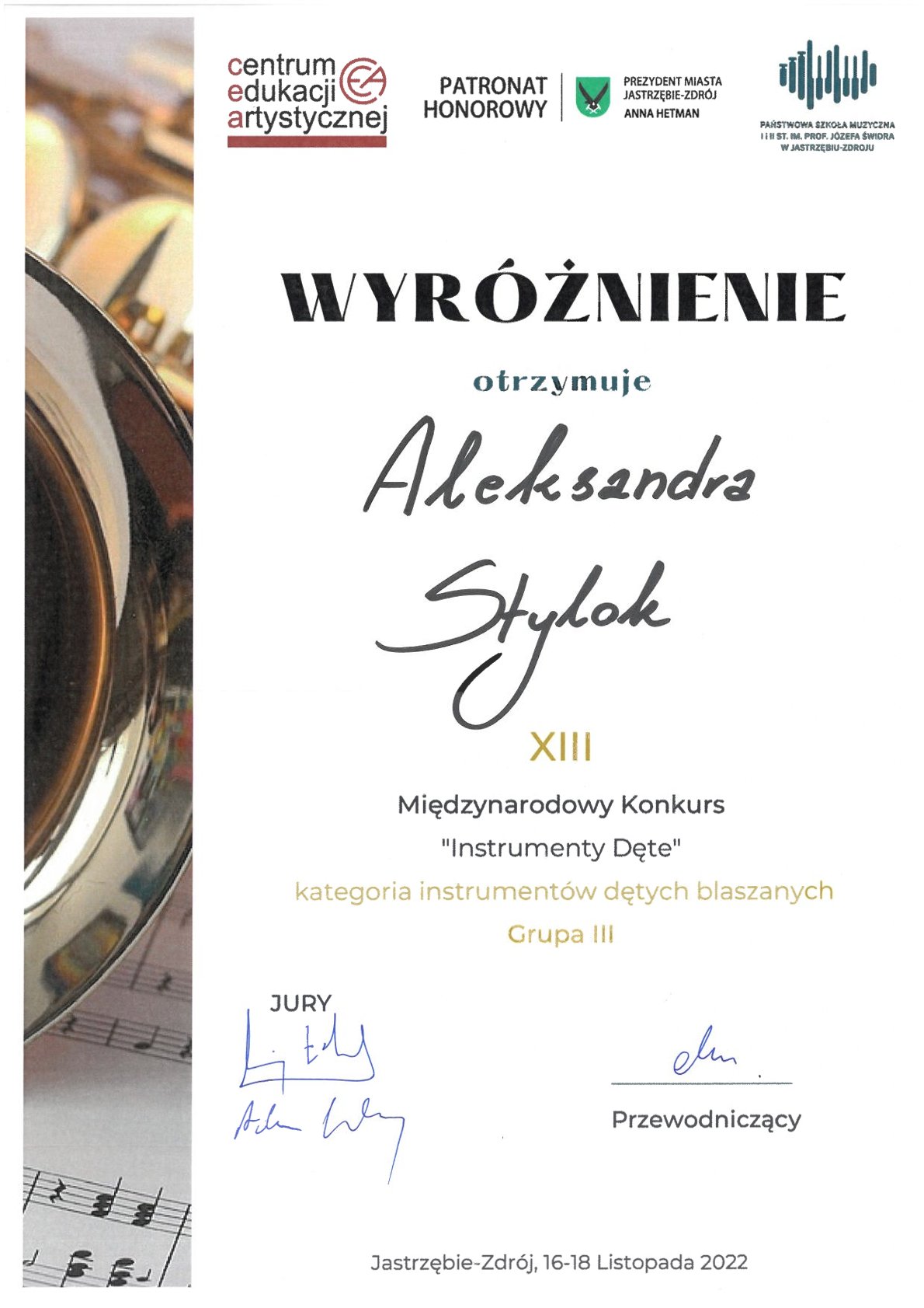 - WYRÓŻNIENIE – ALEKSANDRA STYLOK z klasy waltorni mgra Tomasza Wójtowicza – kategoria instrumentów dętych blaszanych (grupa III)