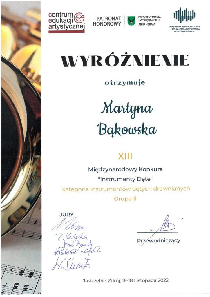 - WYRÓŻNIENIE - MARTYNA BĄKOWSKA z klasy saksofonu mgra Łucjana Brzozy - kategoria instrumentów dętych drewnianych (grupa II)