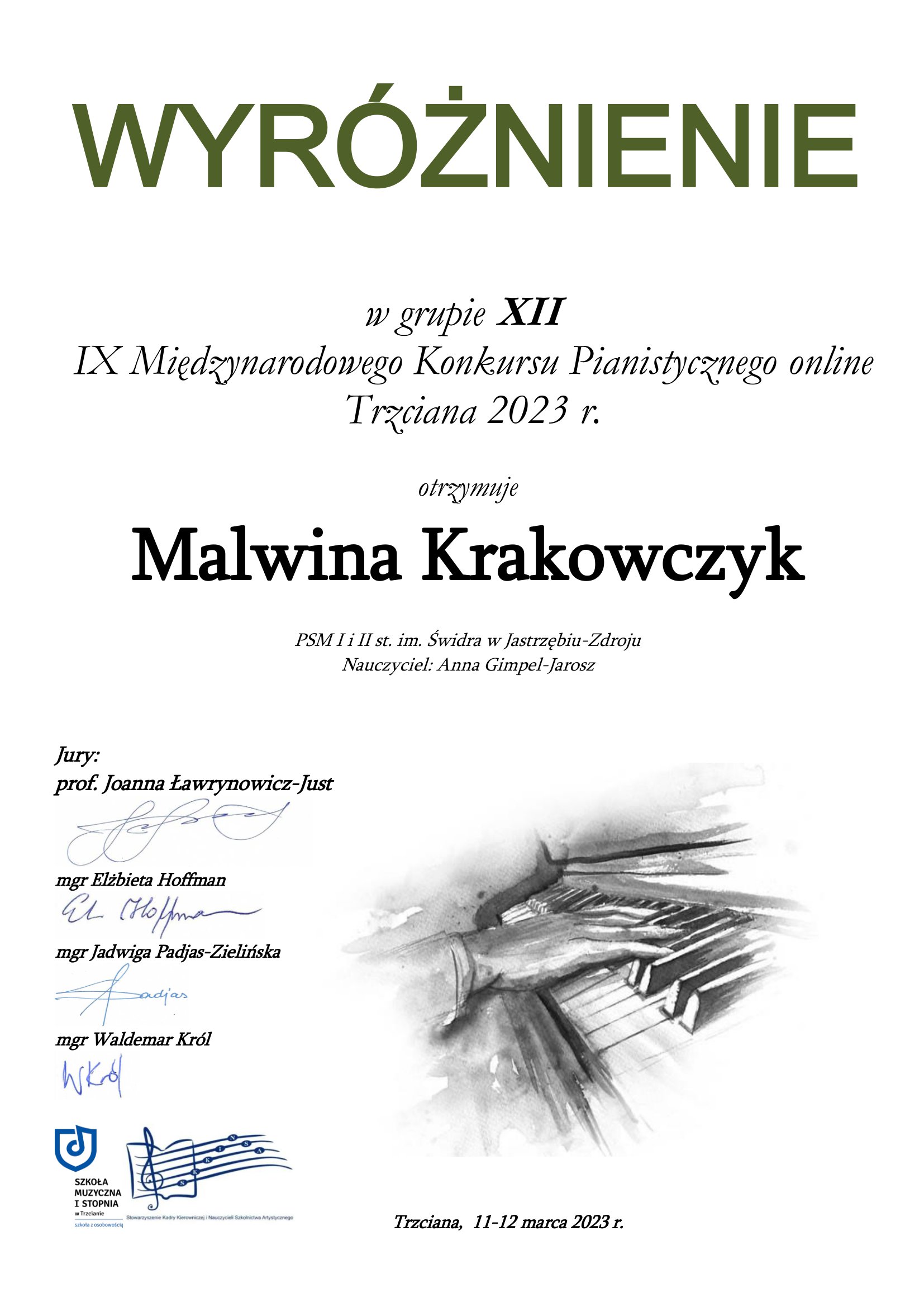 - WYRÓŻNIENIE – MALWINA KRAKOWCZYK z klasy fortepianu mgr Anny Gimpel-Jarosz – grupa XII - The Bach International Music Competition 2023 w Londynie, 10.03.2023 r., edycja online