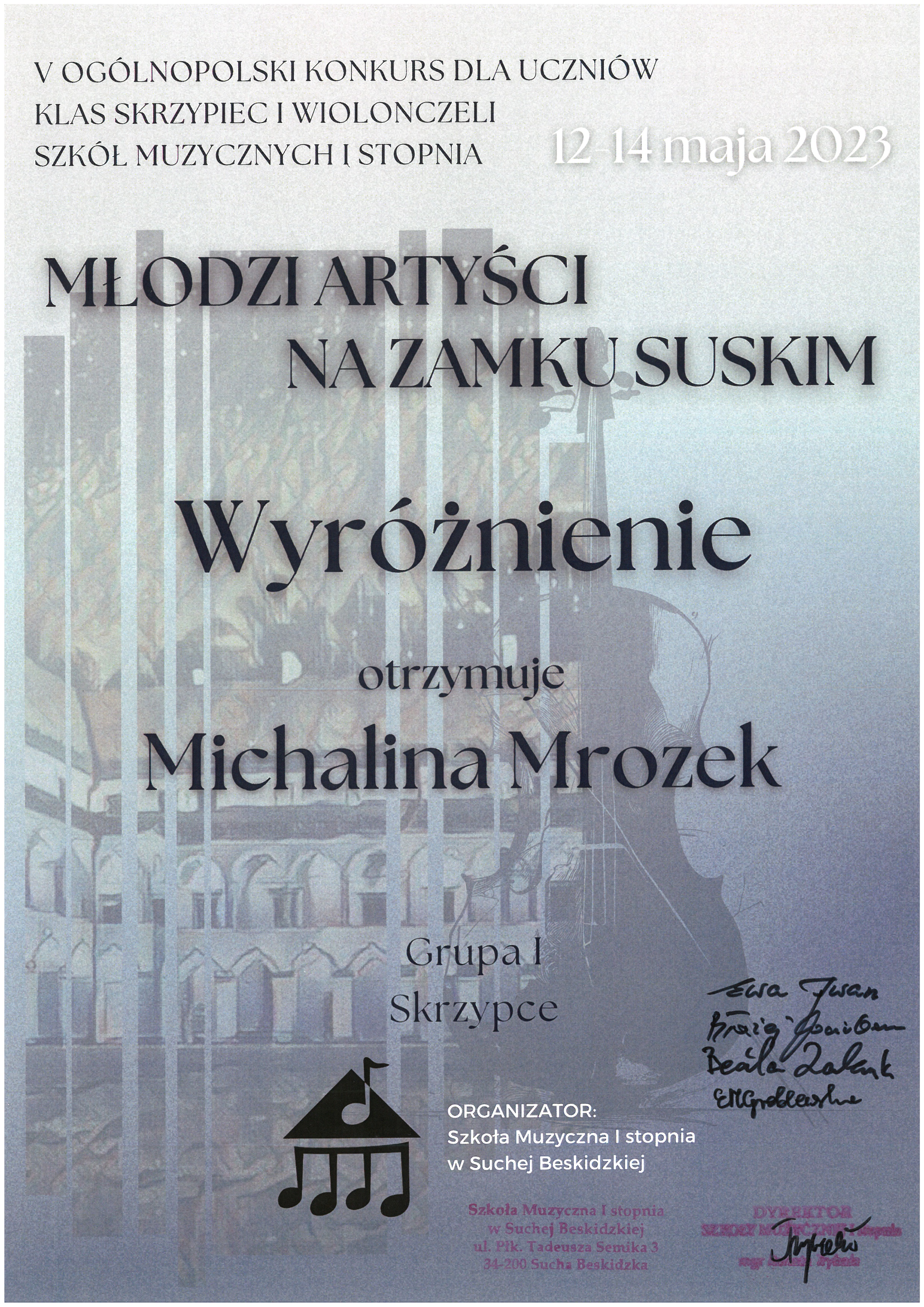 V Ogólnopolski Konkurs dla Uczniów Klas Skrzypiec i Wiolonczeli Szkół Muzycznych I stopnia „MŁODZI ARTYŚCI NA ZAMKU SUSKIM”, Sucha Beskidzka, 12-14.05.2023 r.