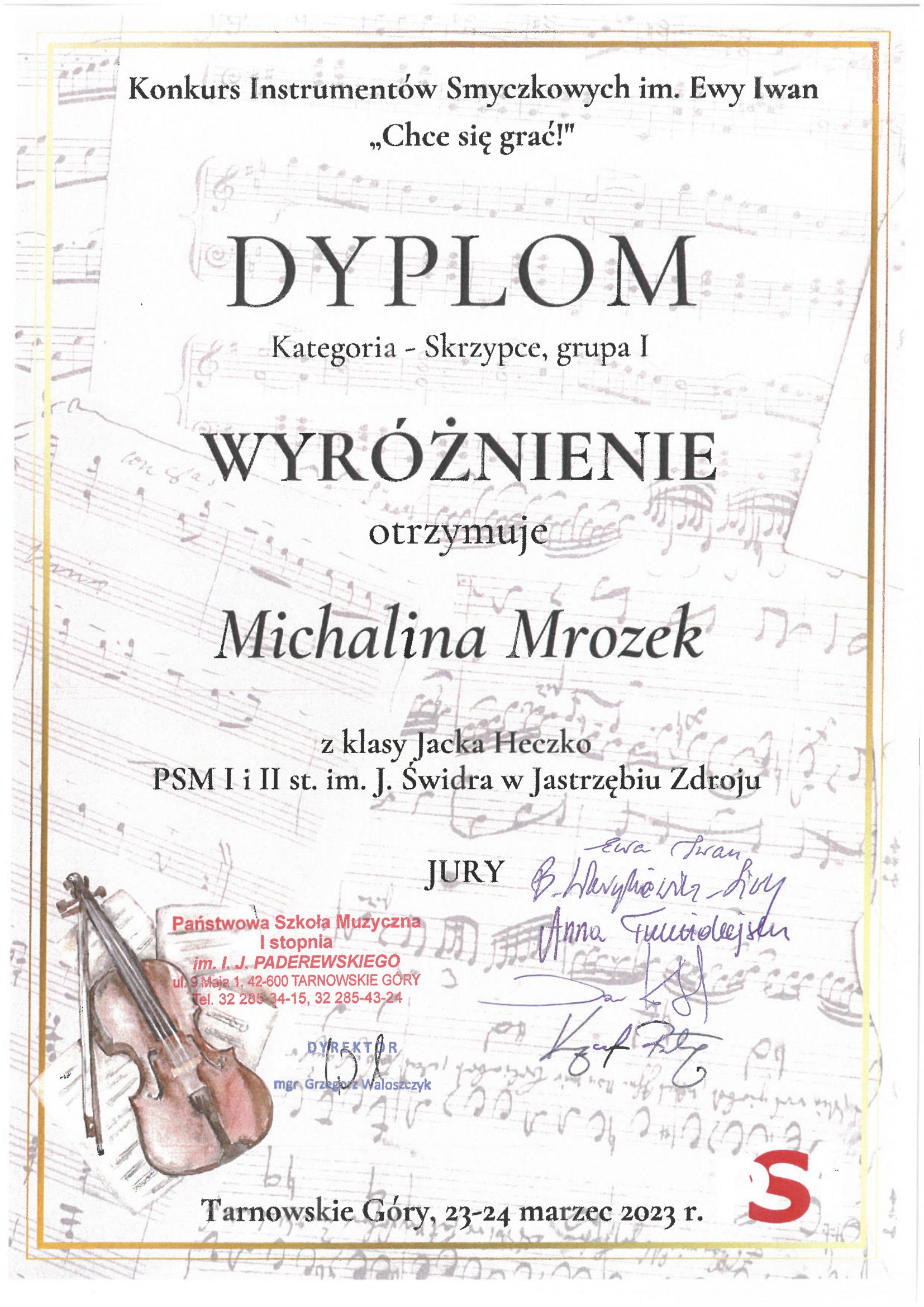 - WYRÓŻNIENIE – MICHALINA MROZEK z klasy skrzypiec mgr Jacka Heczko – kategoria skrzypce (grupa I) -