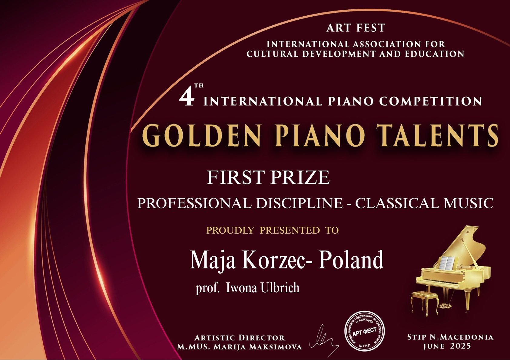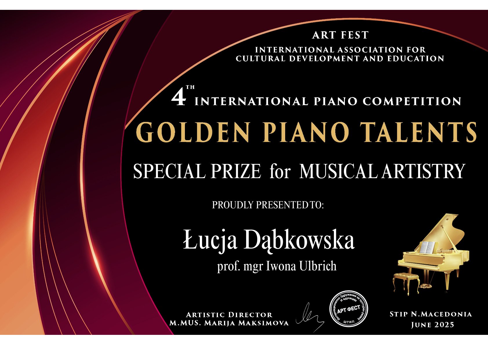 - IV Międzynarodowy Konkurs Pianistyczny GOLDEN PIANO TALENTS, Macedonia, czerwiec 2025, edycja online