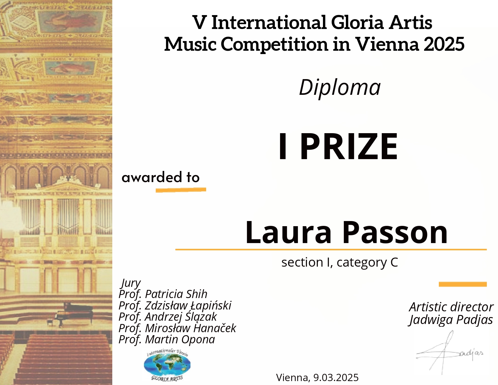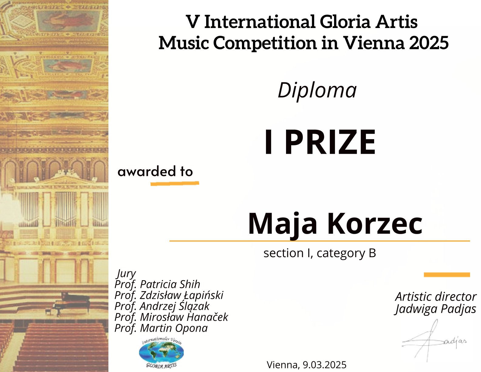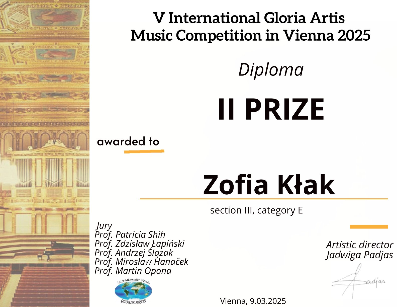- V Międzynarodowy Konkurs Muzyczny „Gloria Artis” Wiedeń, 9.03.2025 r. – edycja online