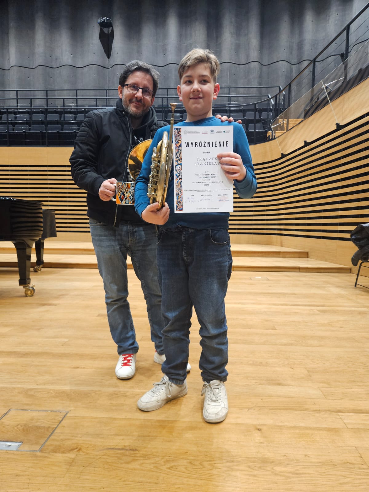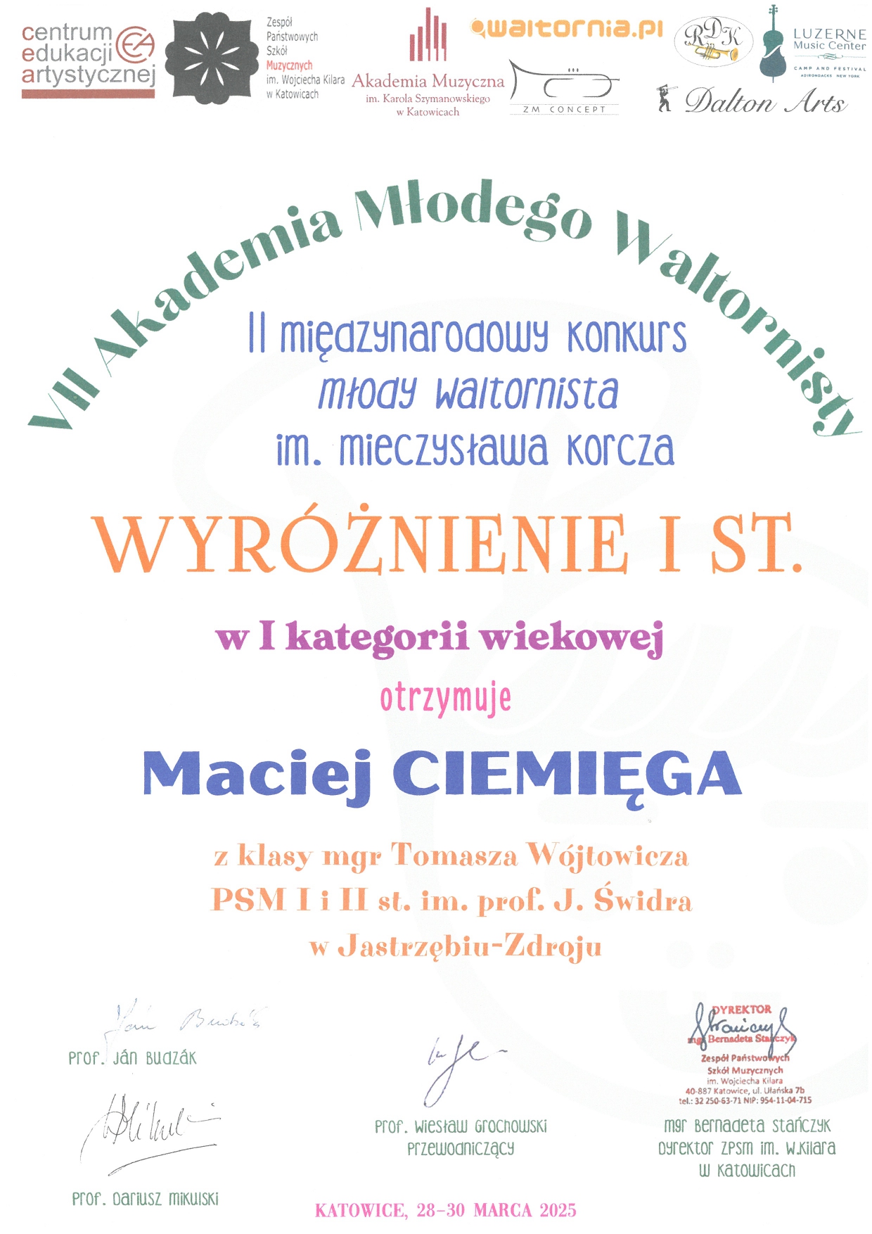 - WYRÓŻNIENIE I st. – MACIEJ CIEMIĘGA z klasy waltorni mgra Tomasza Wójtowicza – I kategoria wiekowa