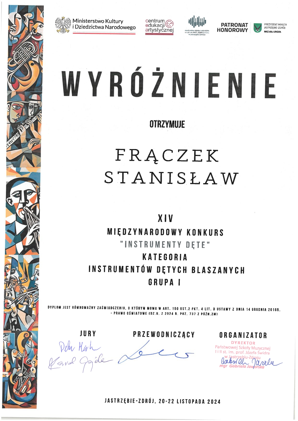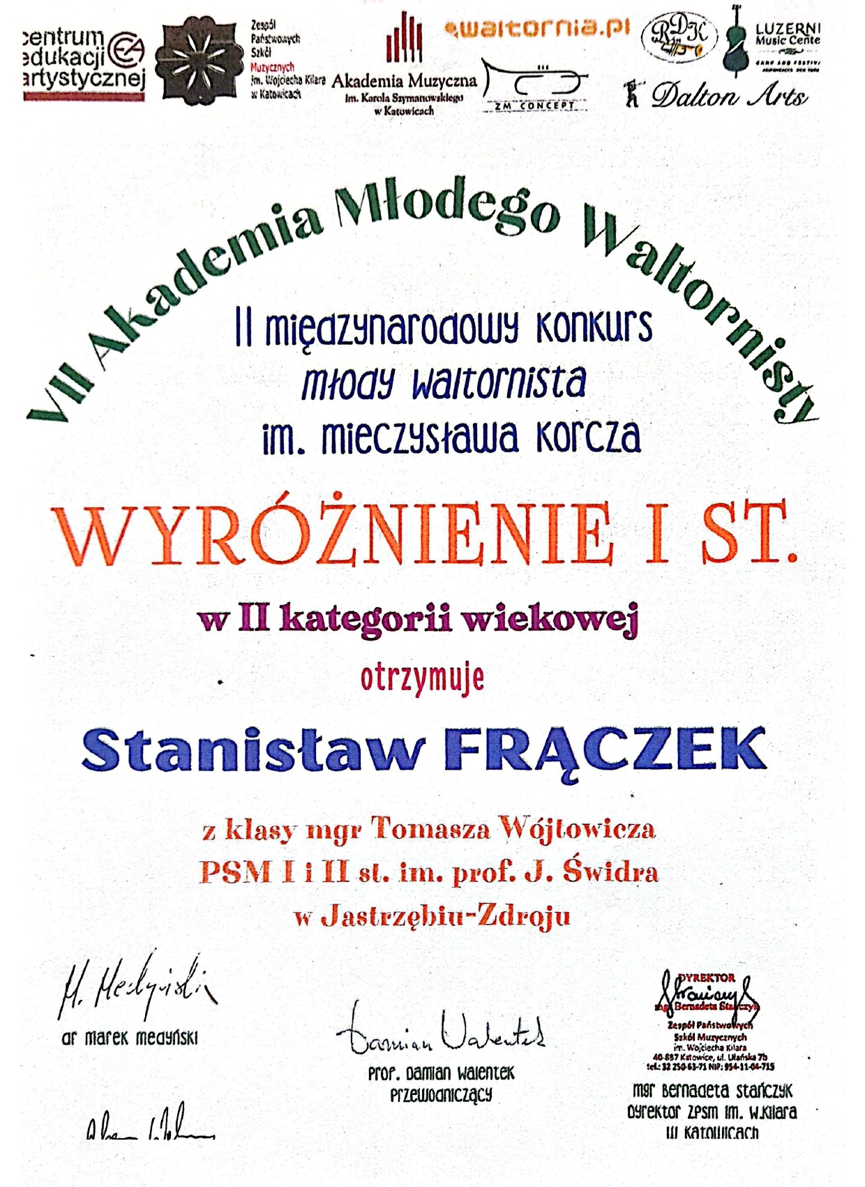 - WYRÓŻNIENIE – STANISŁAW FRĄCZEK z klasy waltorni mgra Tomasza Wójtowicza – kategoria: Instrumenty dęte blaszane, grupa III